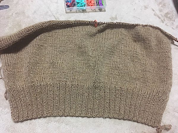 毛糸だまのおじいちゃんカーディガンは後ろ身頃の減らし目に入りました。明日にも後ろ身頃はあみあがりそうです。