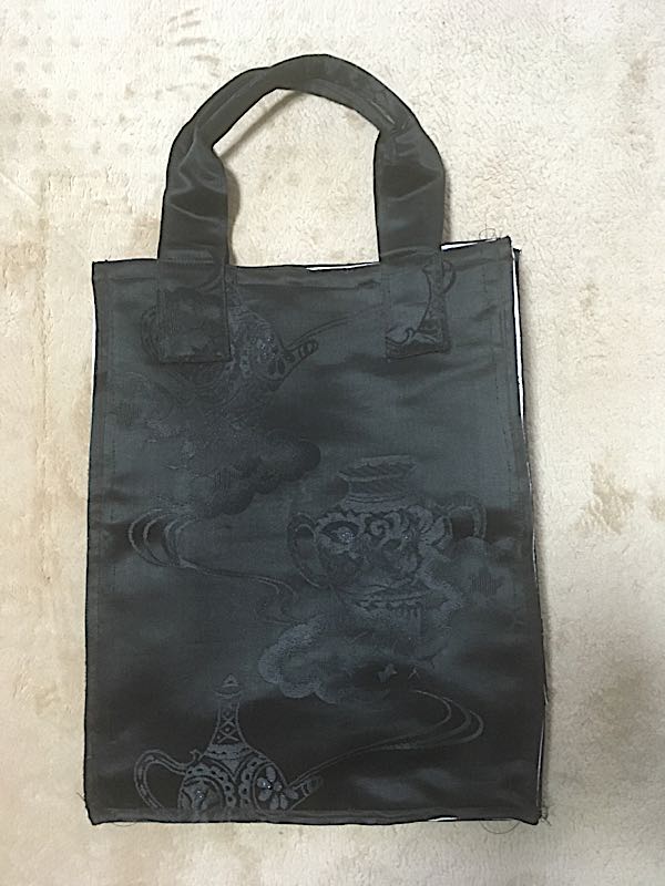 結局、ちょっと重いのですが、サブバッグ2個目完成。前回よりふた回り大きめです。中は白でポケットとマグネットボタン付き横のシルエットは紙袋風白いのがちらちら見えてしまうので、裏も黒、あるいは紫や抹茶色、灰色とかでもいいですね。まだ、帯を買ってあるのでまだ作れますが、次どうしようかな。そろそろ何か編もうかな?