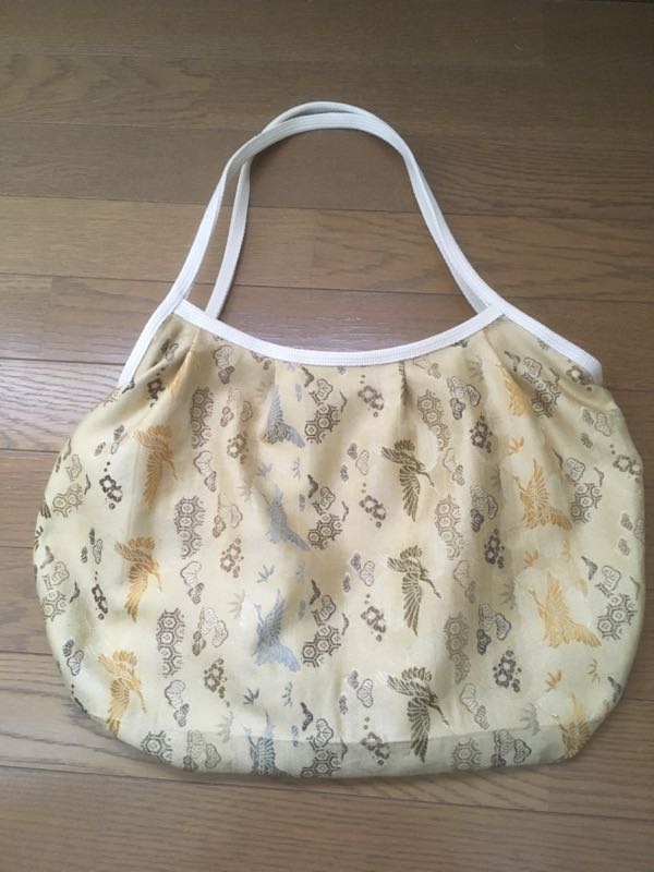 you tubeで見つけて作ってみたかった4枚はぎのバッグをつくりました。型紙の作り方はこちら。https://www.youtube.com/watch?v=jUSBjFwcaRA縫い方はこちらhttps://www.youtube.com/watch?v=JcCFOa-6GCwファスナーポケットを付ける場合はこちらhttps://www.youtube.com/watch?v=UZIcJCrzCzsこんな長いベース形の布を裏表各4枚縫い合わせて作ります。底はこうなります。以前買った帯地の裏と表で配色。裏は着物の八掛のグレーの生地をつかってます。裏は接着芯を貼りましたが、帯地はそのままです。横のループとボタンを止めると台形に。大きめで、すてきにハンドメイドがすっぽり入ります。内ポケットを一つつけました。ボタンを止めないと大きめのトートバッグです。帯の幅いっぱいに作ったので大きめになりましたが、もう少し小ぶりにしても使いかってのいいバッグになるとおもいます。帯バッグは革のバッグより軽くて、あたりが柔らかいのがいいですね。耐久性は劣るでしょうが。次に気になってるのはこちらのポーチhttps://www.youtube.com/watch?v=_GwIDo7Zm2Mこれも作ってみたいな。