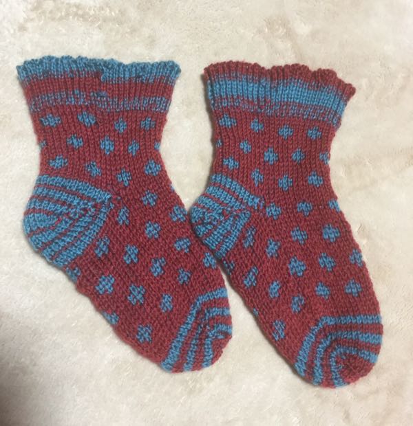 水玉模様の靴下の水通しが終わりました。 両面編みになってます。履き口のゆるみをとりすぎてフリルになってしまったのが反省点。次こそは納得できるものを!で、次は靴下を編もうか、それとも帯地のバッグかポーチを縫おうか考えてるところです。考えている間に靴下編み始めた方が早いかな。2玉消費で累計8玉消費。 毛糸の在庫は年初が693玉 現在685玉となりました。 作品はマフラー1つ 靴下3足