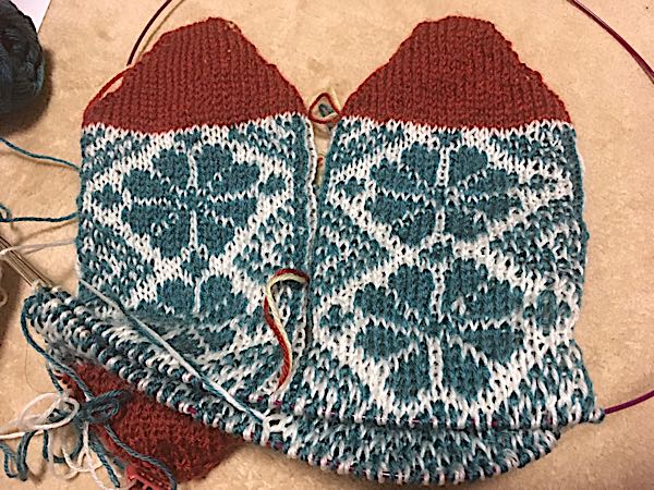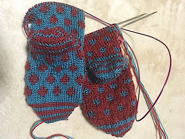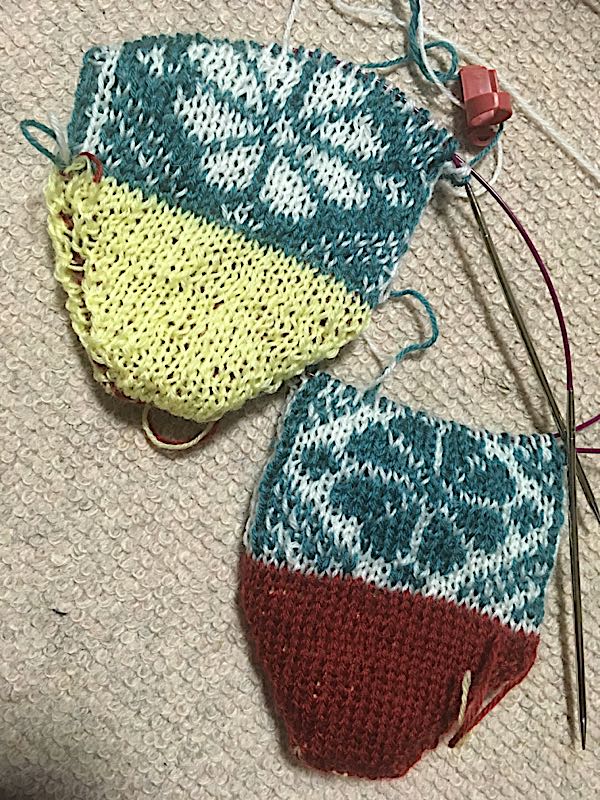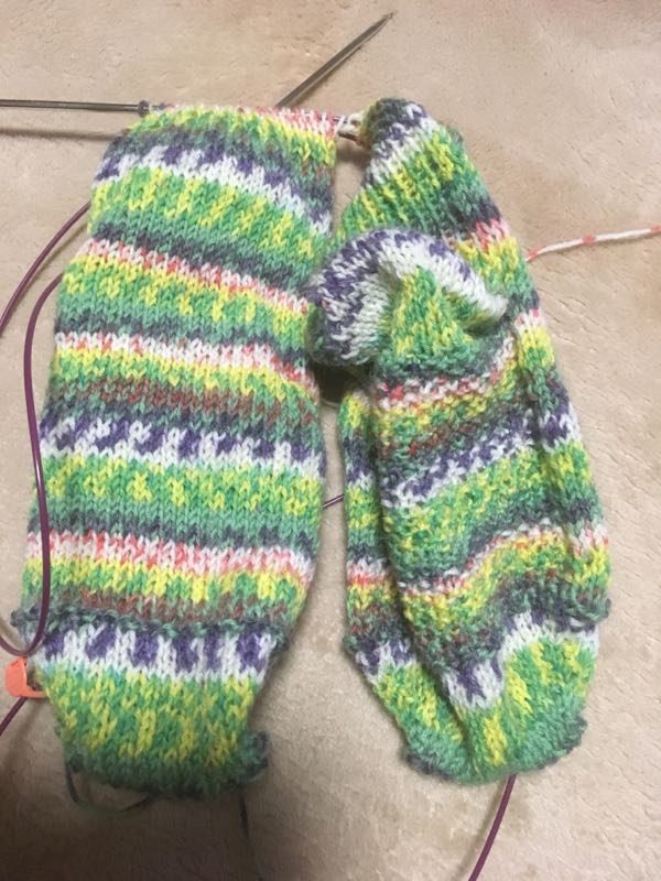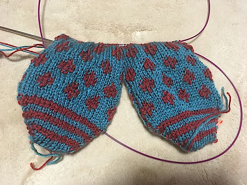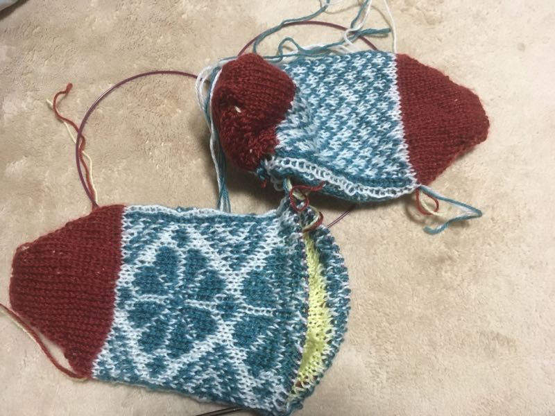 やっとかかとまで。編みこみ間違えてるし( ゚Д゚)左の裏側のチェックが乱れてる。ま、いいか。とりあえず完成をめざします。