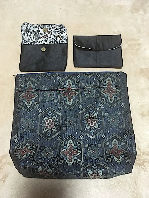今日は、着物地と帯地でポーチを作りました。黒いのが繻子の帯地、柄の方は着物地です。外ポケット2つつけました。内布は着物の八掛地 化繊です。表はウールの着物地。マグネットボタンもつけました。おまけでクラッチバッグも。ポケットと柄を合わせてみました。持ち手はとりはずせます。ファスナーつけ、まだまだきれいにいきません。もう少し修行が必要ですね。