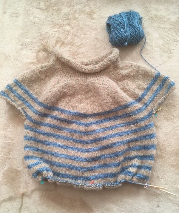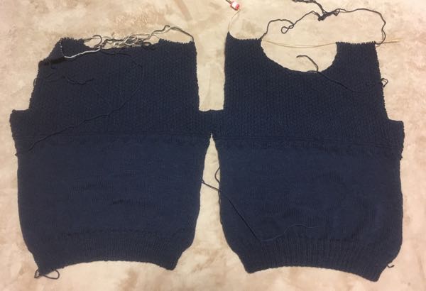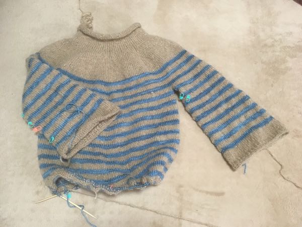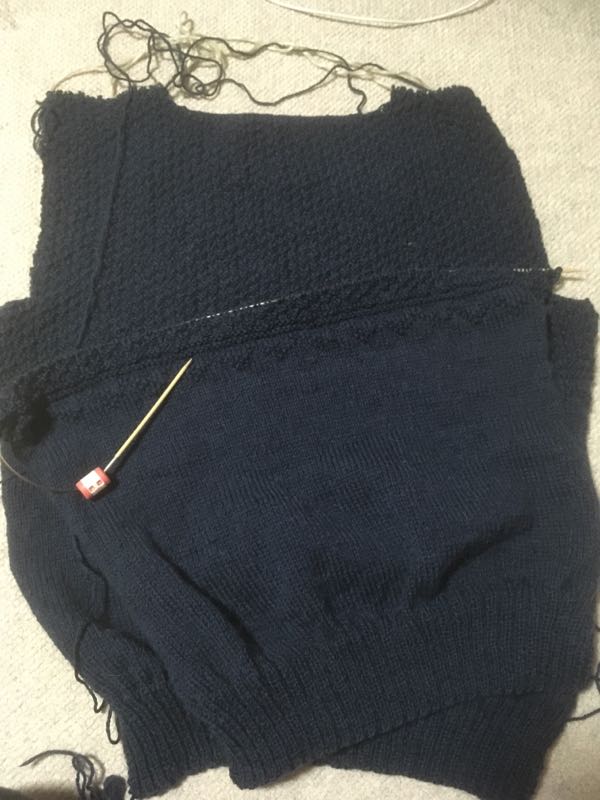 風工房さんの定番ニットの表紙のセーター、 身頃があみあがりました。 次は袖ですね。 ここまでで、11玉消費。 在庫は18玉なので、残り7玉。 たりるかな?なんとかなりそうな気もするんだけど。