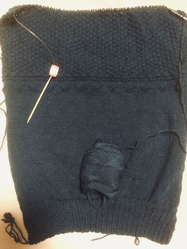 色がきれいに出ませんが、濃紺の糸で編んでます。 あと少しです。