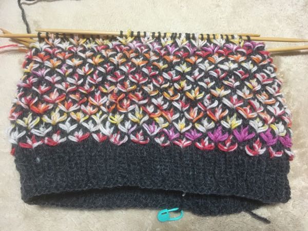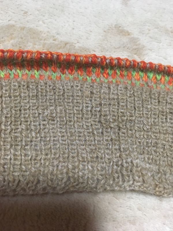 風工房さんの定番ニットのモザイク模様のセーター。 ここまで編んだのですが、なんか柄がキチキチ。 針の号数をもう一つあげようかと思います。 ほどいてやり直しです。