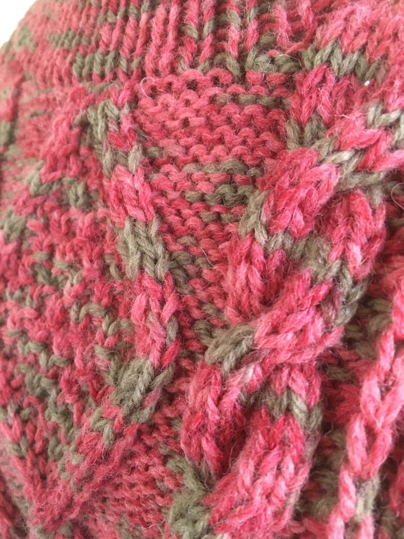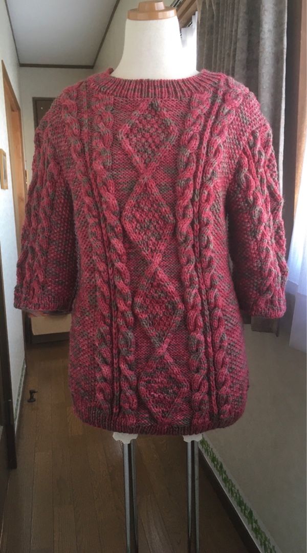 キャンドゥで見かけて、興味本位で20玉買って編み始めたセーターは、丈を長めにしたら袖が足りなくなって、5分袖に。