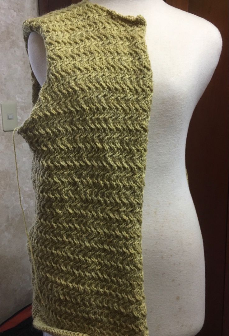 右前見頃が編み上がったのでボディに乗せてみました。