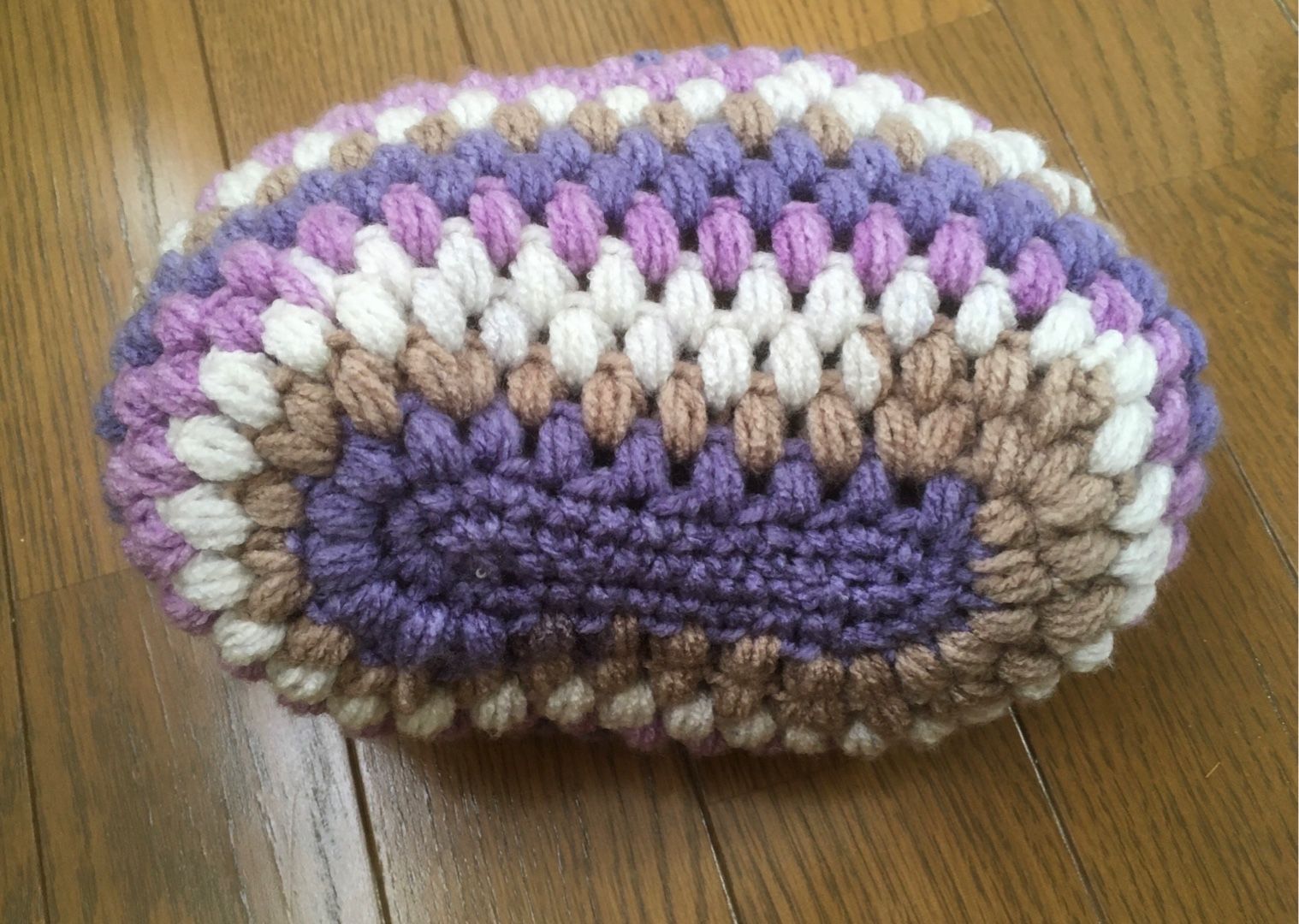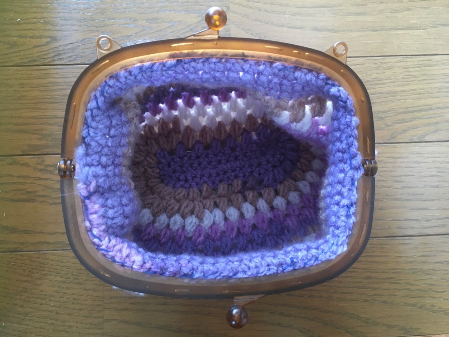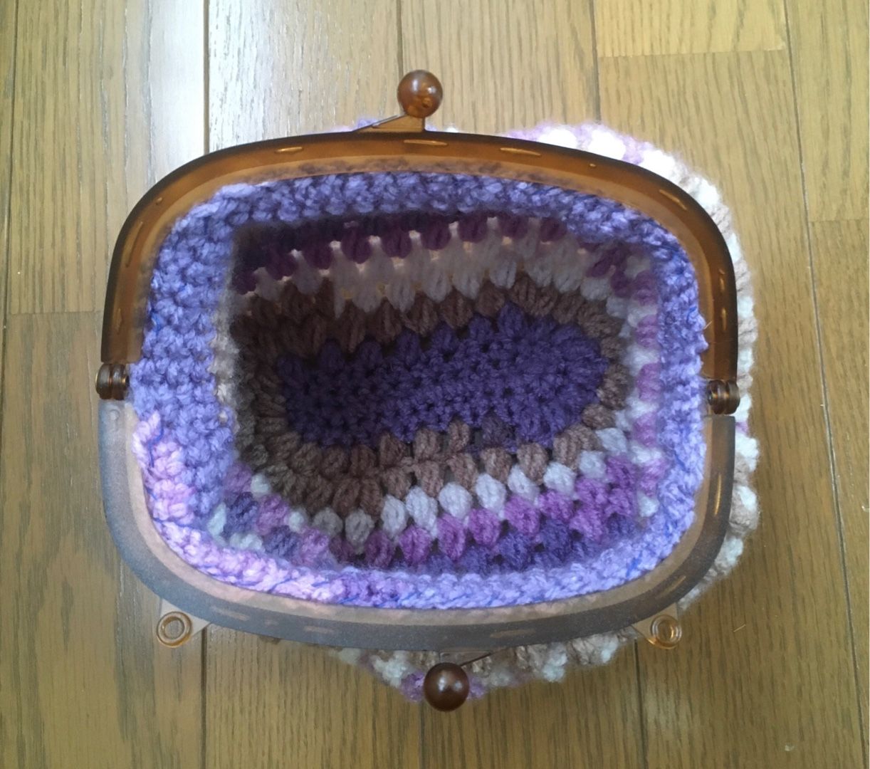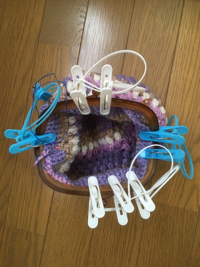セリアで見つけたプラスチックの大きめの口金を使い、たま編みポーチ。
