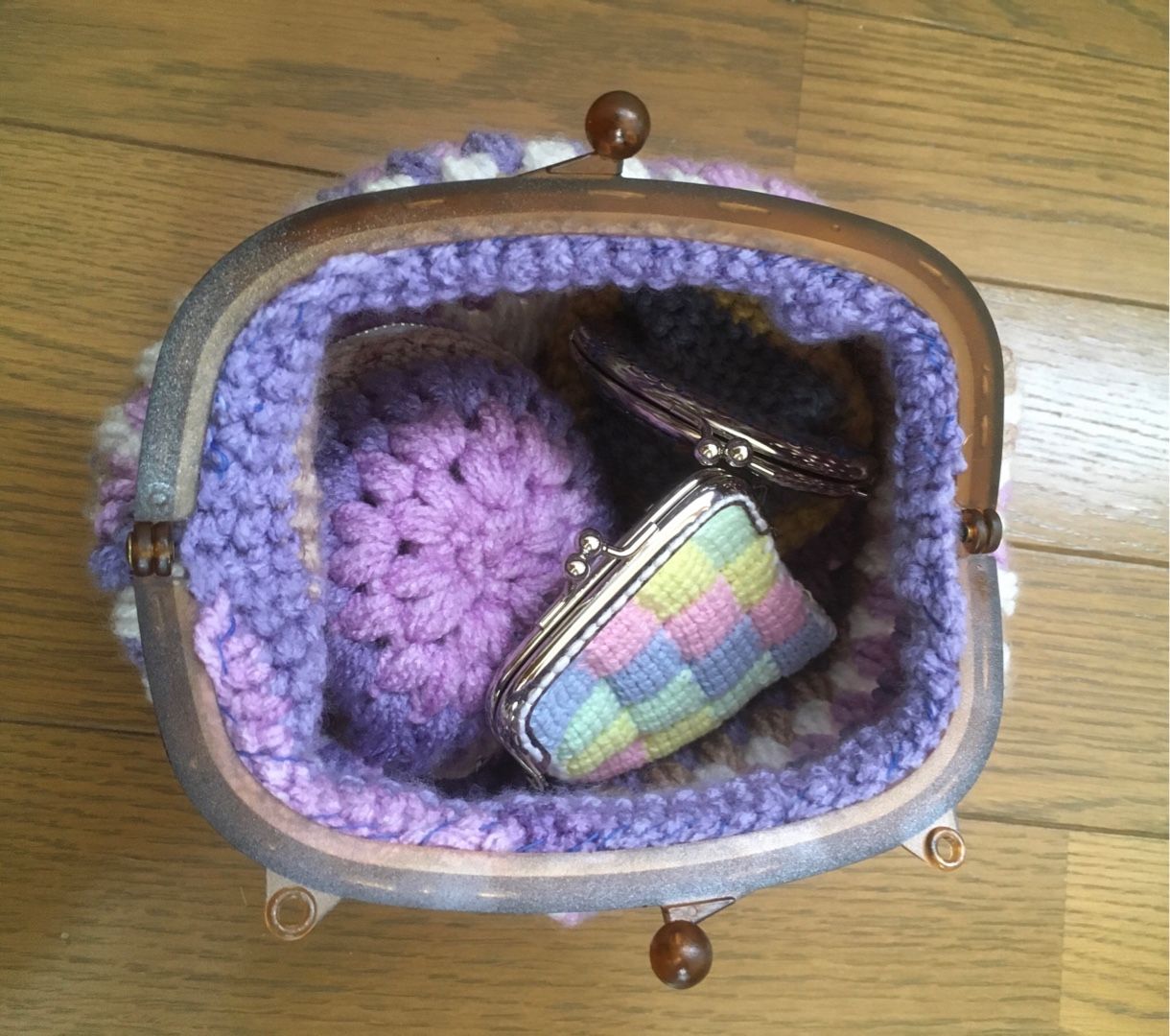 先日編んだ、がま口2つとポーチがはいります。