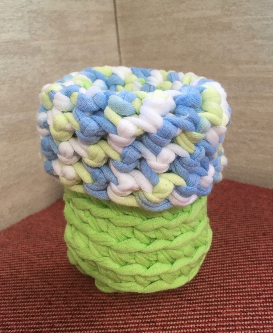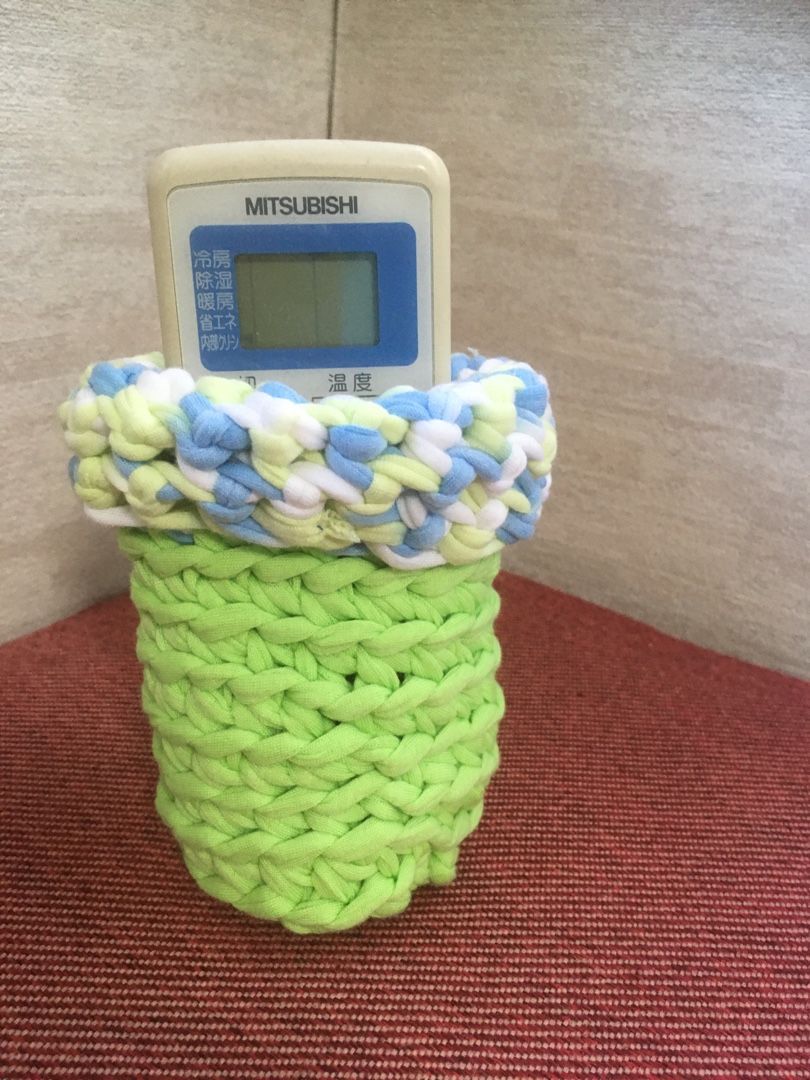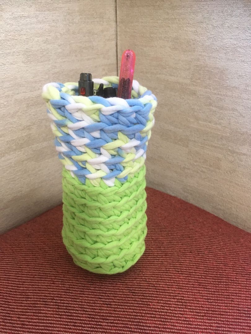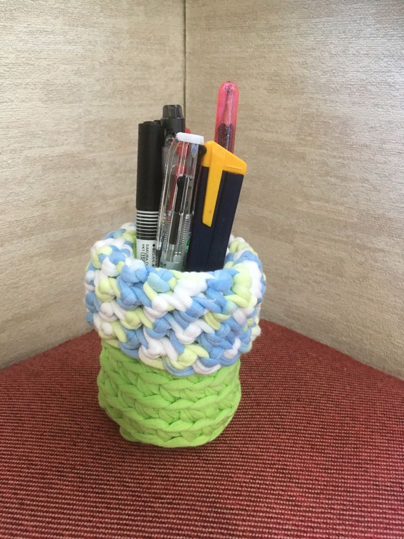 その時に、編み地がしっかりしていて、自立することに気がついたので、ペン立てを編んでみました。