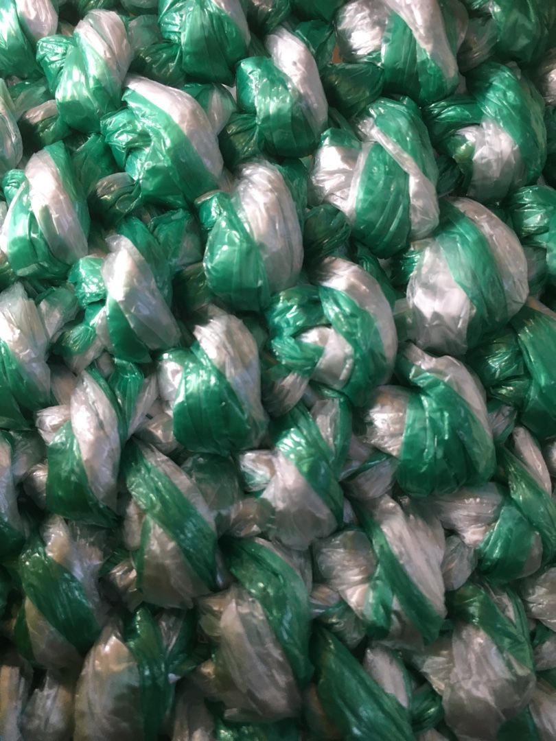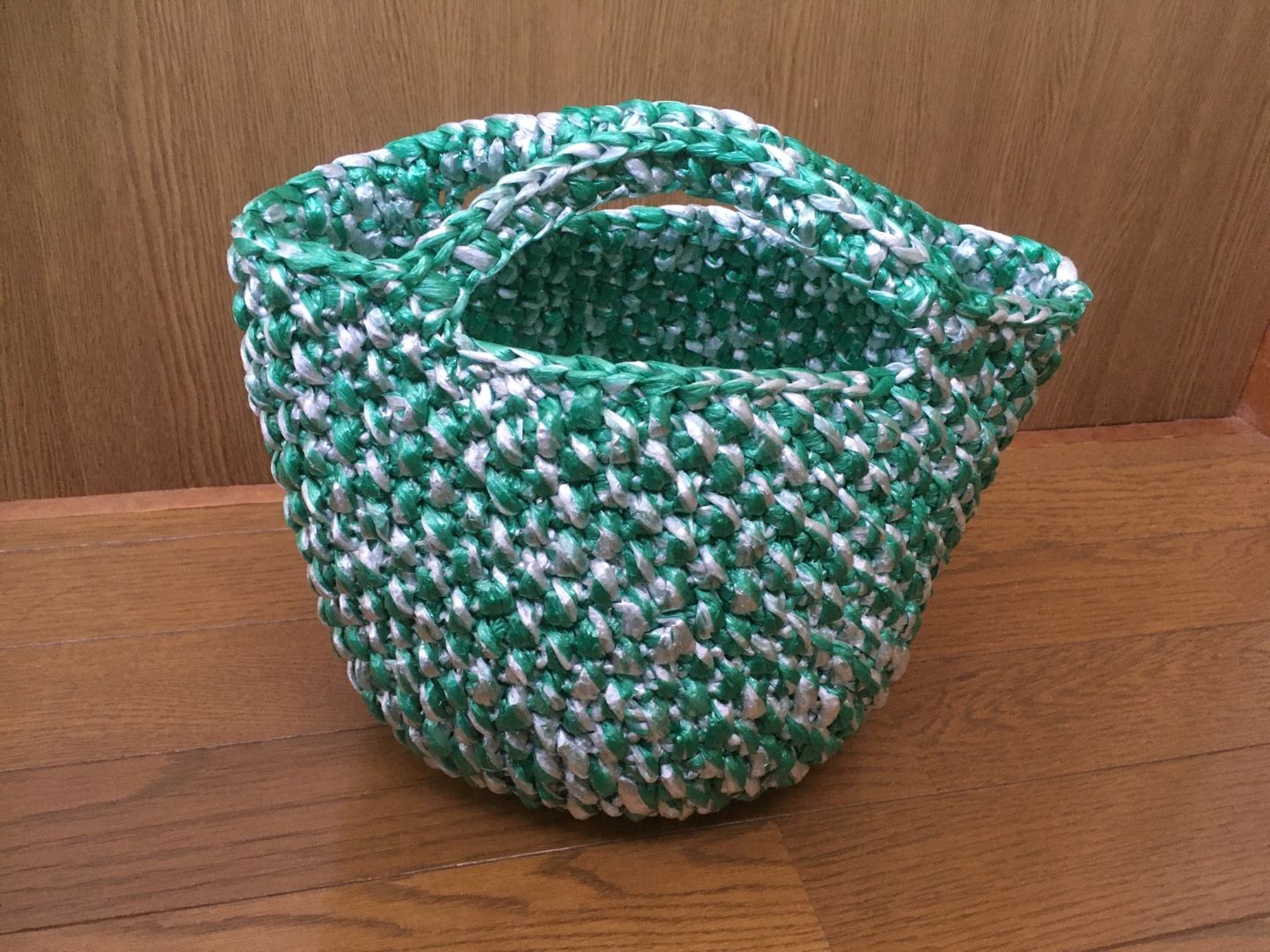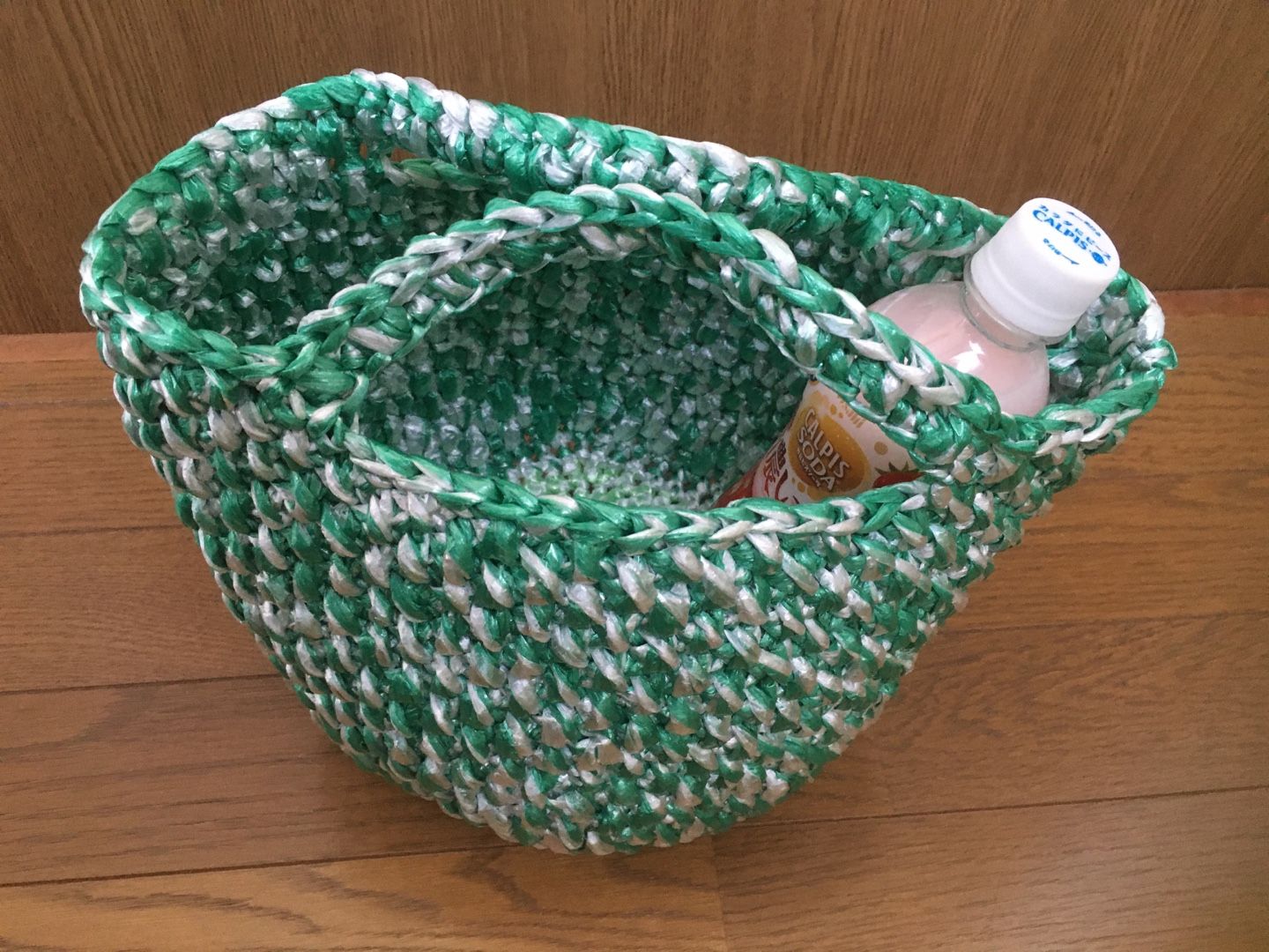 前回、編んだビニール紐のバッグ、自己流に編んだのが気に入らなくて、動画を参考に編み直しました。