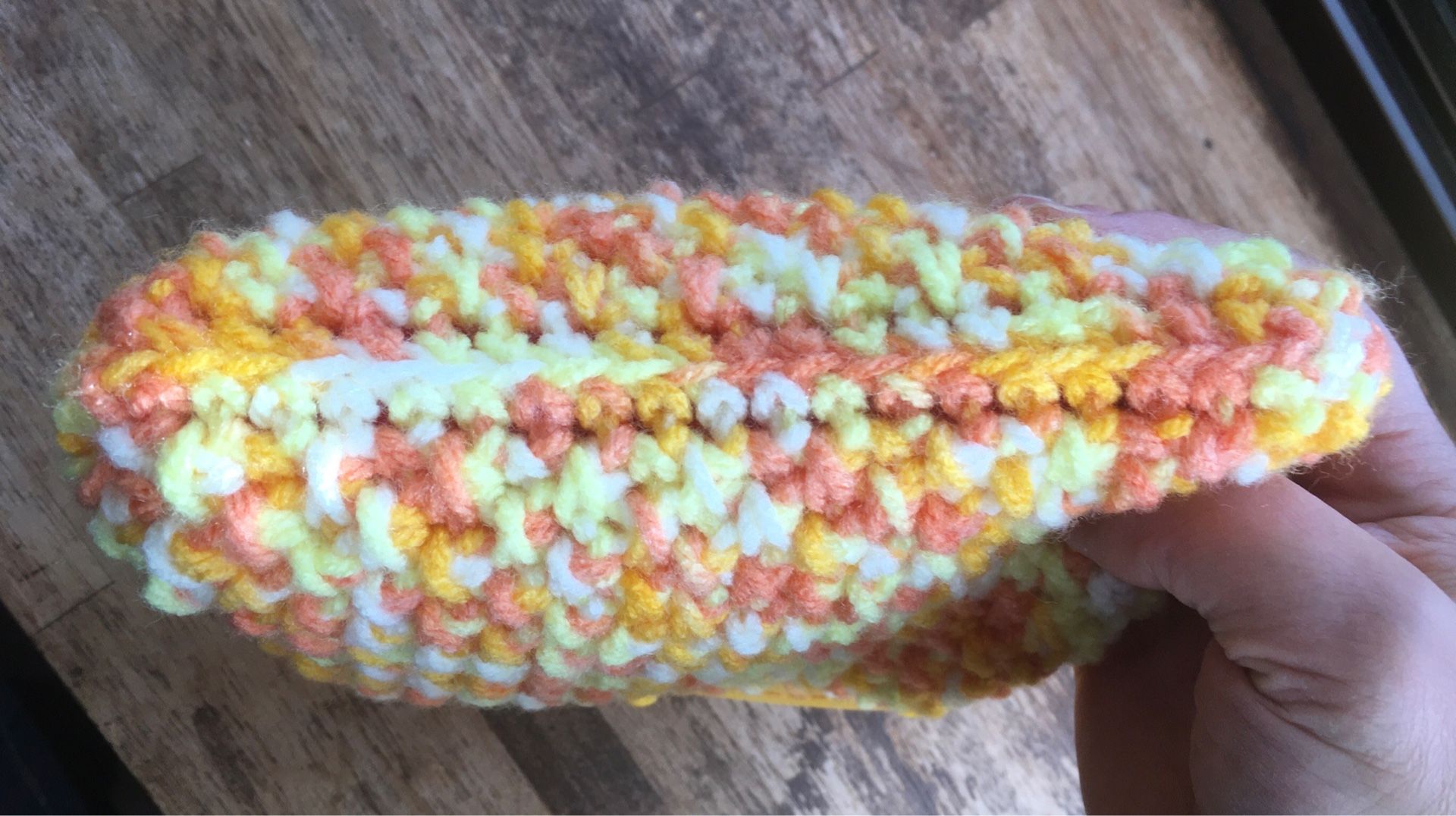 編み地も昨日のビニールテープのバッグと同じ編み方でポコポコしてます。