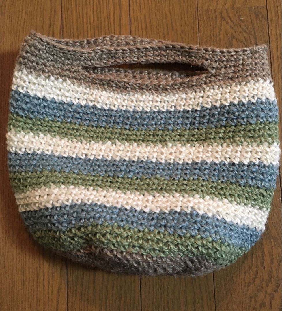 ナチュラルカラーの写真撮り忘れましたが、これを4色使ってしましま丸底のミニトートをあみました。
