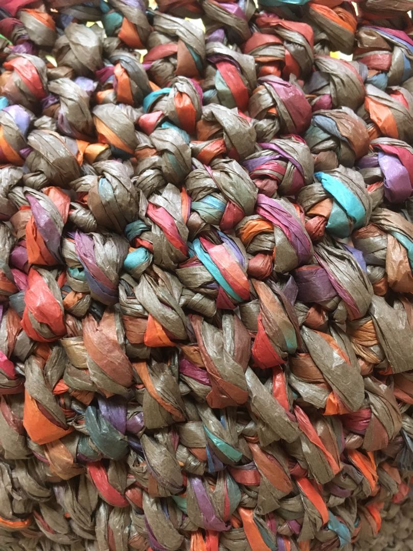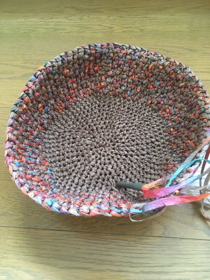 側面は以前、ビニールテープのバッグを編んだ時に使った模様で編んでます。