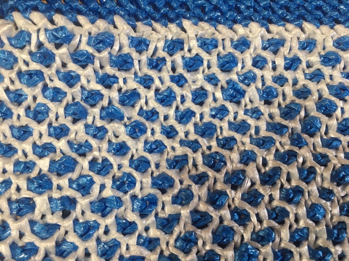 ビニールテープで編んでいたダブルフックアフガンのバッグ、編み上がりました。