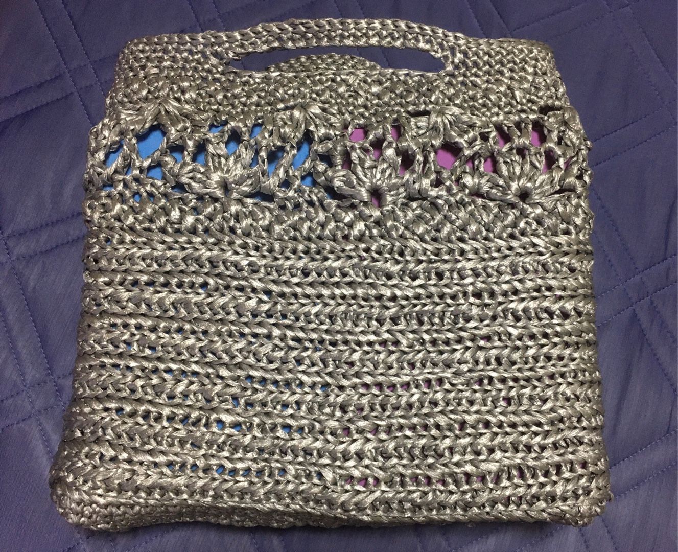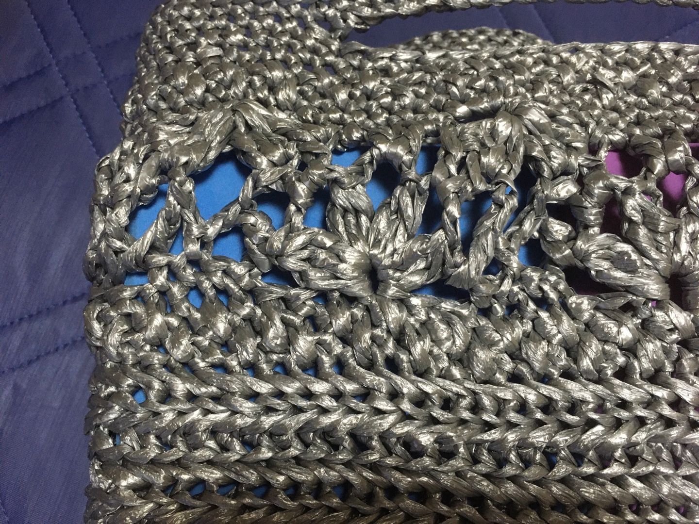 スズランテープで編んでいたヘリンボーンステッチのバッグは、大きな細編みとメイプルリーフステッチの模様を加えて編み上げました。