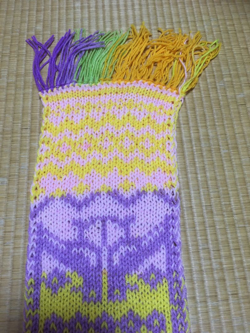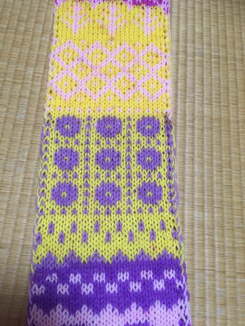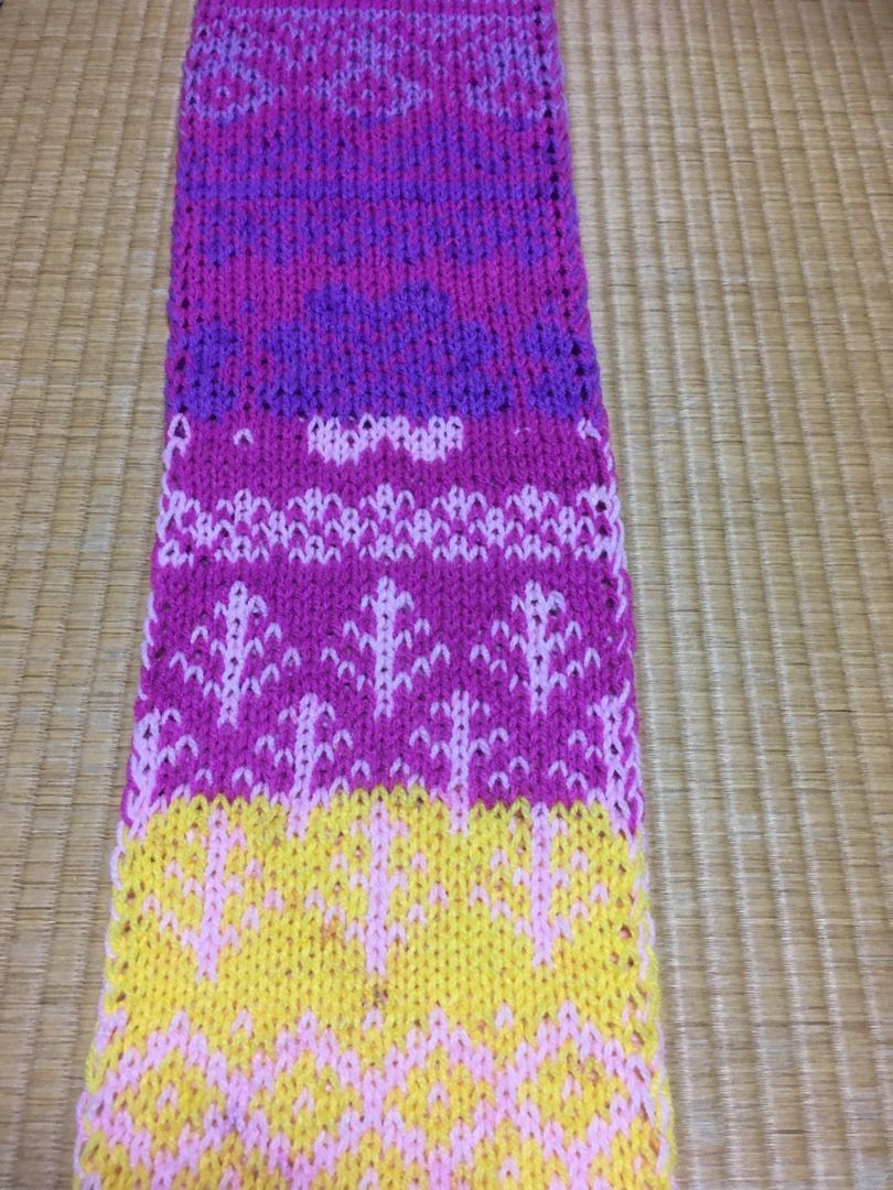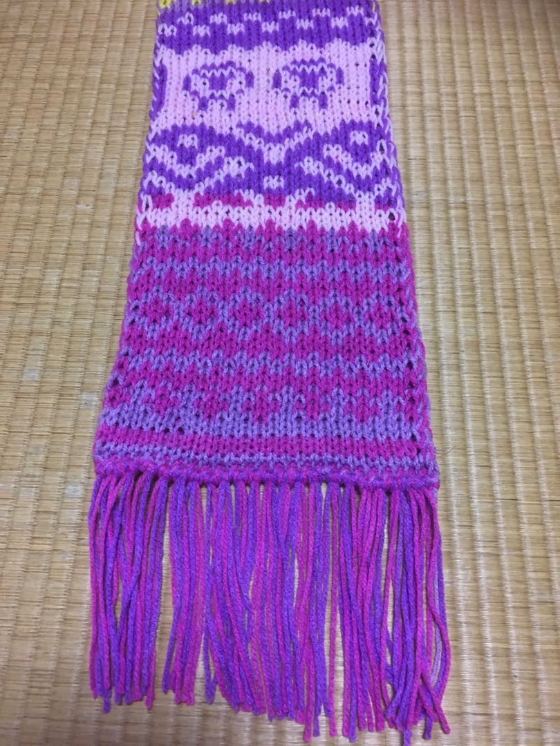 DAISOの200円毛糸のパティシエ ブロッサムで両面編みのマフラー完成しました。
