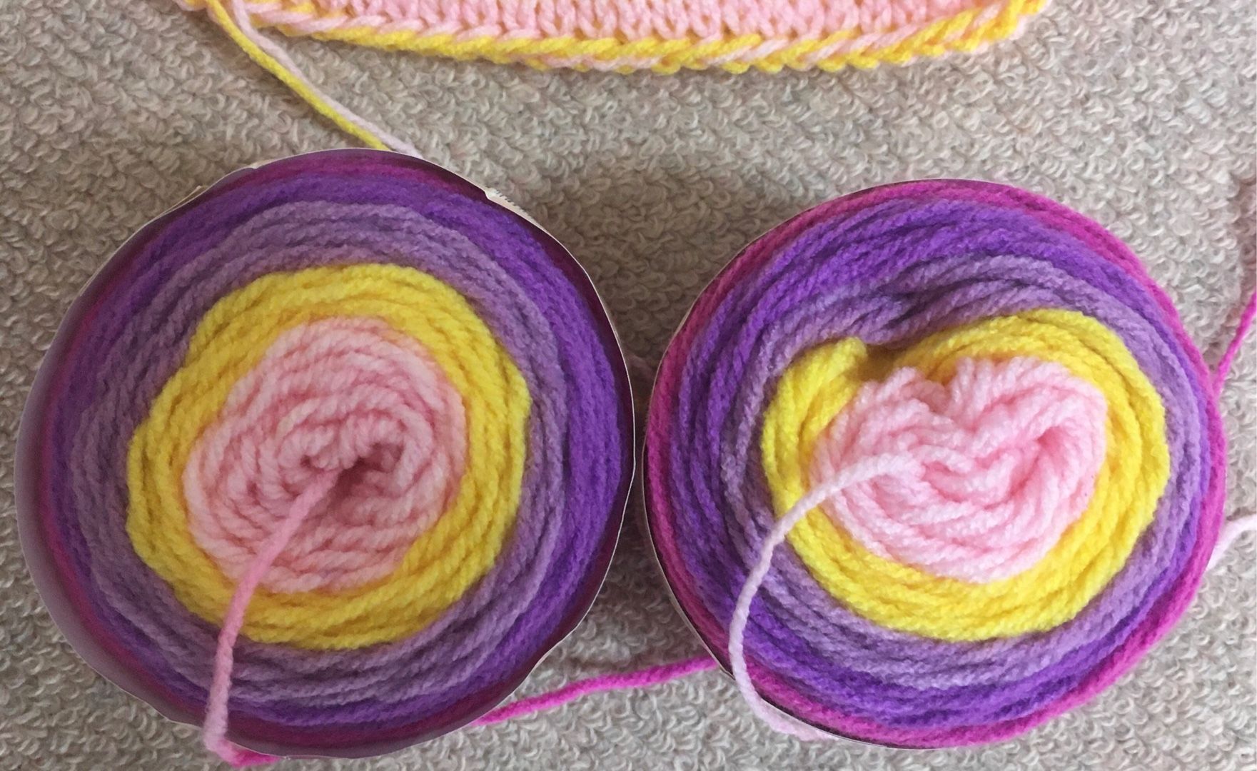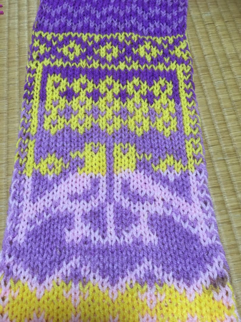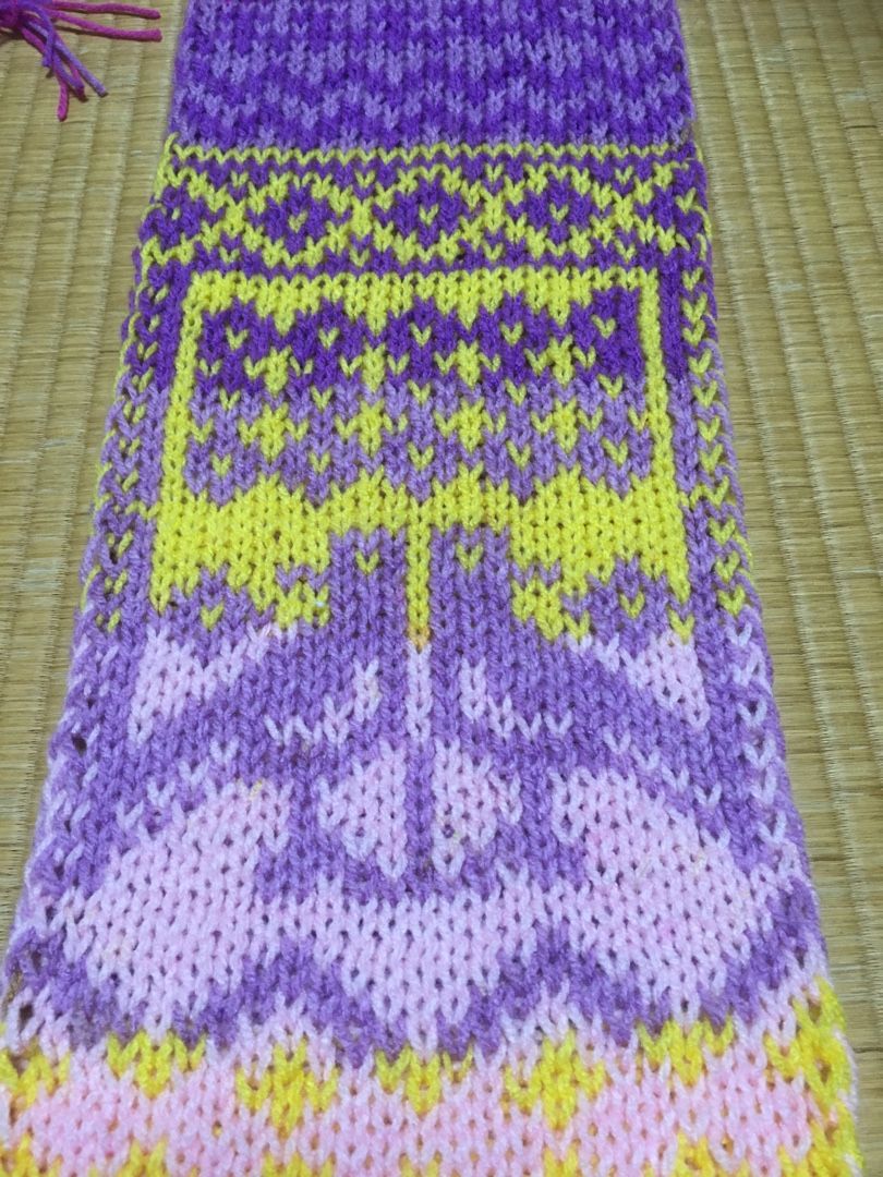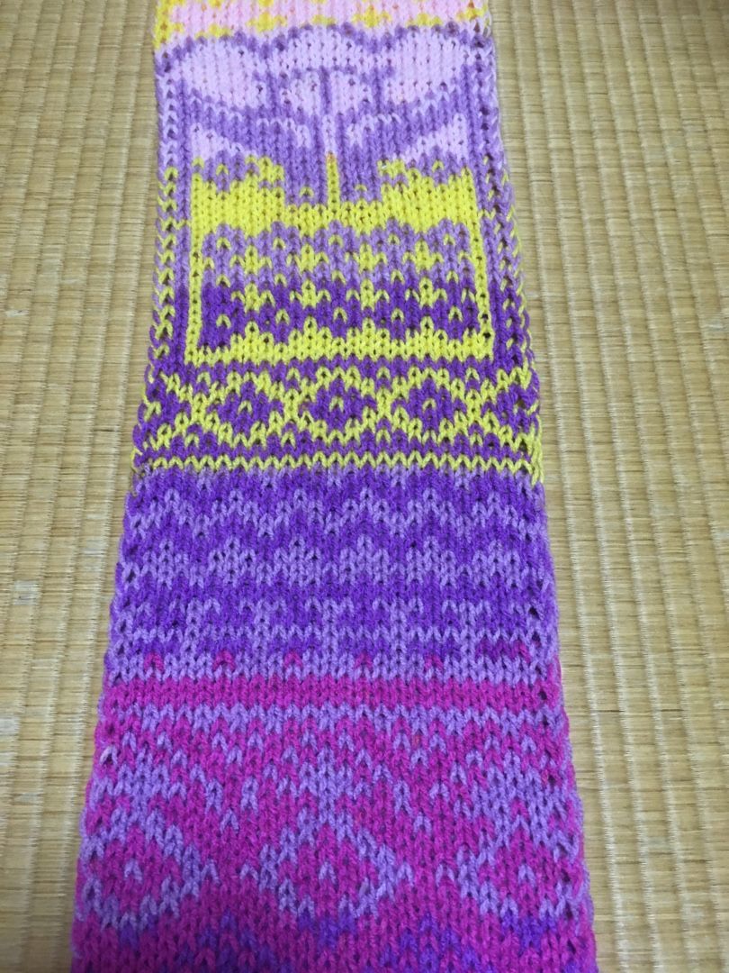 DAISOの200円毛糸のパティシエ ブロッサムで両面編みのマフラー完成しました。