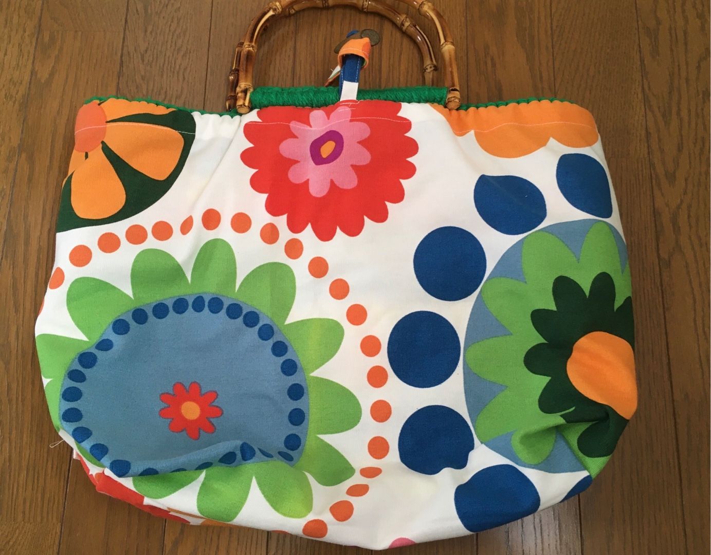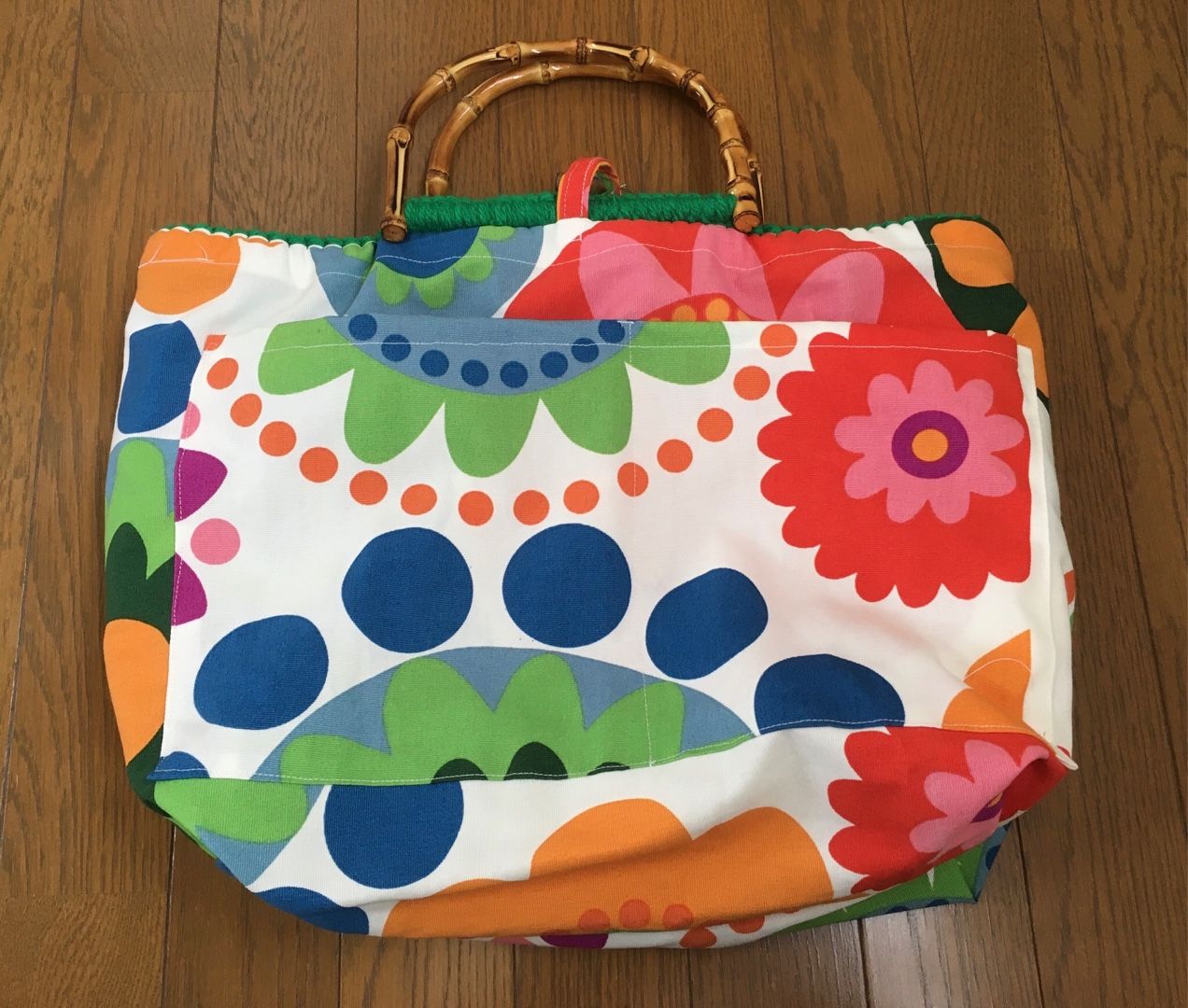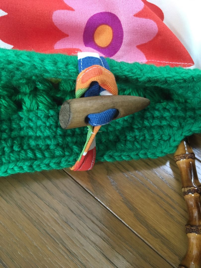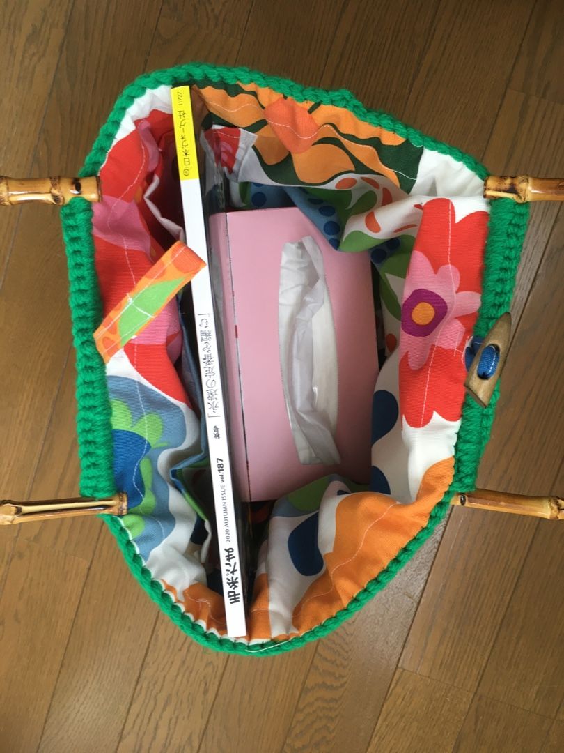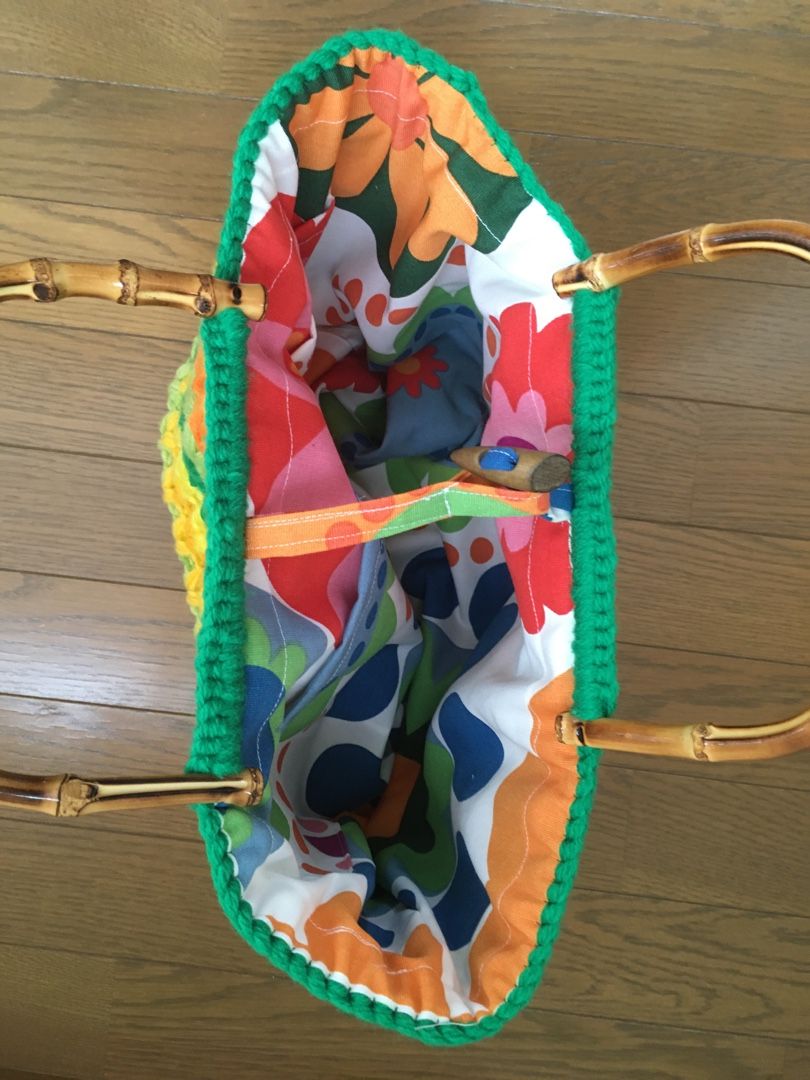 DAISOのパティシエ シトラスと、アクリル毛糸 並太を使って編んでいたバッグに持ち手と内布をつけました。