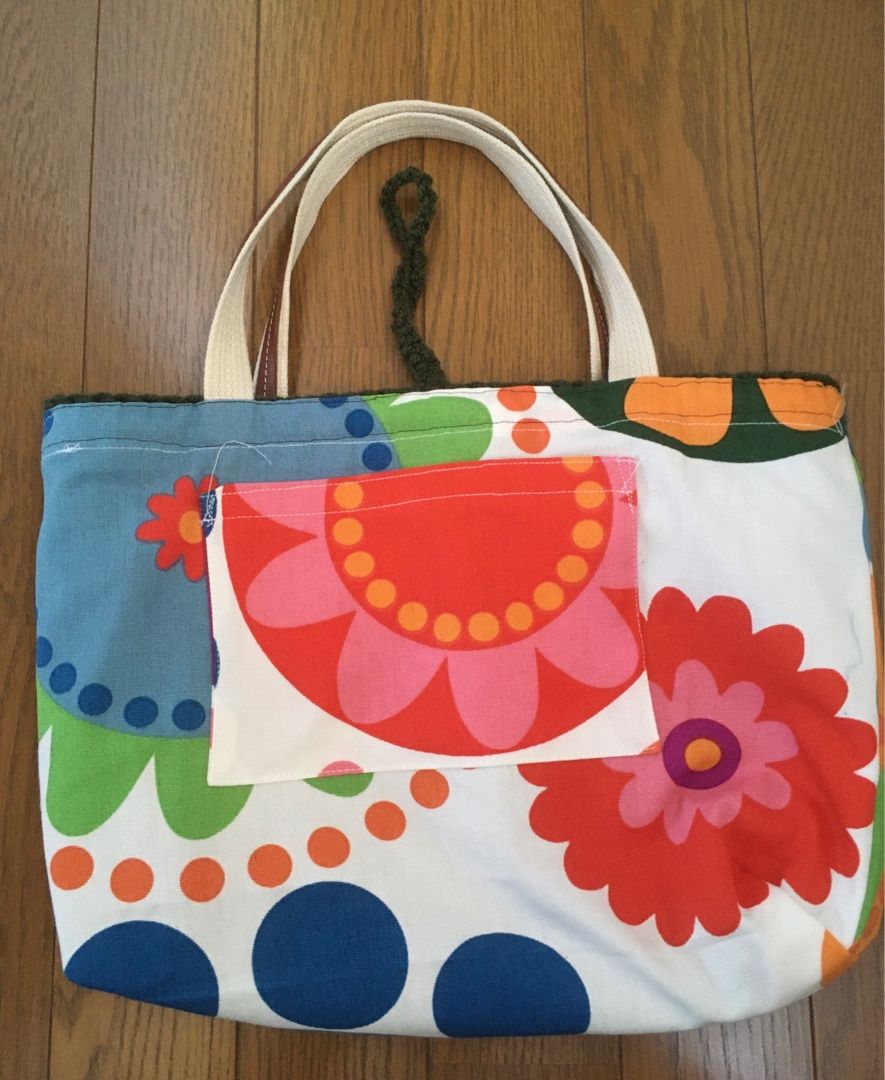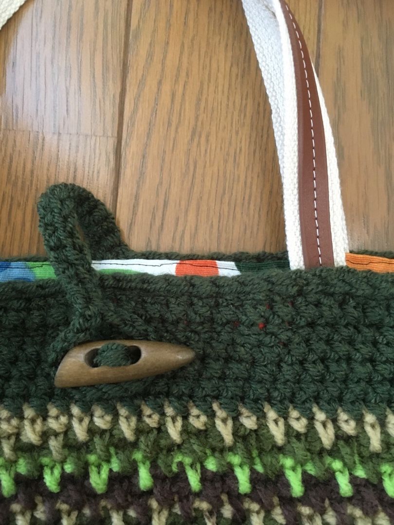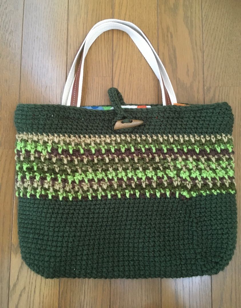 底と入れ口をメランジの緑を使って編んで、内布にはIKEAの帆布使用。