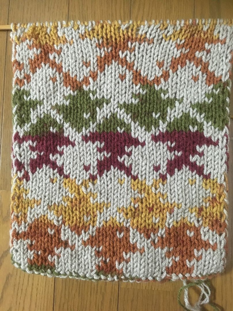 エッシャーの魚という模様でマフラー編んでます。