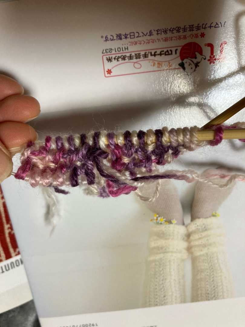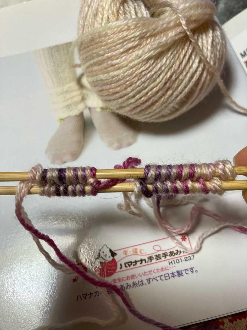 2本どりを分けた1目目を表編み、2目目を裏編で渡し糸は間にはさみこんでいきます。
