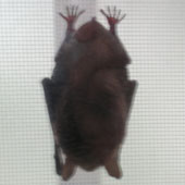 朝、窓を見たときびっくりしました・・・。なんと↓が網戸と窓の間にいたのです!!何だと思いますか?インターネットをフルに使って調べました。あるHPによると・・・それは主に本州、四国、九州にいる、哺乳類のアブラコウモリだったんです!!最初はカエル?いや毛が生えてる・・・ネズミ?にしては尾も無い・・・。大変でした。別名イエコウモリと呼ばれていて、建物に住み、蚊などを食べてくれるようです。っということは・・・住み付くってこと!?その前にあんな狭いとこにいて何も思わないんだろうか・・・?