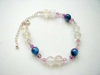 スポジュミン(リチア輝石:ピンクに発色するものがクンツァイト)と、青いカヤナイトを使ったブレスレットです。リチア輝石は透明なのが少ない石なのですが、これは5Aで、すごくクラックが少ないです。カヤナイトもいいグレードの物が入ったので“o(* ̄o ̄)o”ウキウキ♪です