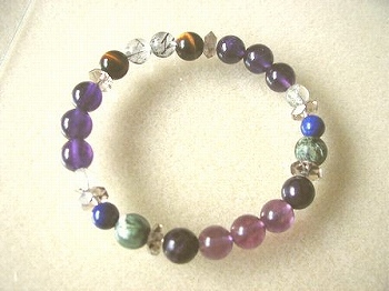 霊感UP+自信アップ+大地との対話のお題を頂いたのでブレスレット作ってみました。昨日も作ったのですがそれにスギライトをいれてバージョンUPしてるはず~。見た目はどうでしょか。 <順序>フローライト紫 スギライト 煙水晶 セラフィナイト ラピスラズリ 煙水晶 ガーデンクォーツ アメジスト 煙水晶 タイガーアイ トルマリン入り水晶