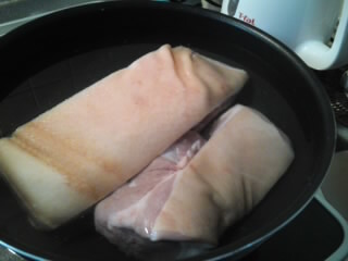 ヾ(*′○`)゚.+:。゚☆こんばんわぁ~☆ 今日から、9月ですね・・これから、だんだん秋を感じてくることが、増えてくるのでしょうか(´・ω・`)モキュ?沖縄では、まだまだNATSUが、続きそうですが・・さて、沖縄でのお盆も終わり、今度は、Uターンラッシュε=ε=ε=┌(o゚ェ゚)┘は~ちゃん♪も、沖縄のお盆を、感じようと、郷土料理第二弾・・『らふてー』に、挑戦しました゚+。(ノ`・Д・)ノオォオォ。+゚こちらの、お盆時の三枚肉は・・皮付きなんですね(´゚Д゚`)ンマッ!!これで、1kg分のお肉です・・まずは、ひたひたの水で、茹でます(*´・д・)*´。_。)ゥミュ沸騰したら、灰汁をとり、笊にあげ、お肉は、綺麗に、水洗い・・洗い終わった肉を、5cm角に切り、鍋に、ひたひたのお水を入れ・・今度は、1時間、茹でますφ(・ェ・o)メモメモこの時点で、また、灰汁が出れば、綺麗に取ります・・1時間後、またまた、笊にあげ、綺麗に水洗いします(・ ε ・)フーン新しいお鍋に、合わせ調味料を、作っておきます・・・ 水 2カップ・ 鰹だしの素 一袋(シマヤだしの素の小さい袋を使いました)・ 醤油 1/3カップ・ 砂糖 1/3カップ・ 泡盛 1カップ(30度)このお鍋に、2回茹で洗った、お肉を、ドボン!あとは、ふたをして、焦げ付きに注意しながら、汁が煮詰まるまで、弱火で煮ていきました(・∀・)ウン!!時間にして、5時間位かな・・疲れたけど、こんな艶々に(*'∀'人)ワォ☆もう、お箸で掴めないくらいです・・仕方ないので、トングを使って、2個づつ、ジップロックしました♪冷凍しておけば、いつでも、食べられるもんね≧(´▽`)≦アハハハハハお夕飯には、2個づつ、盛り付けてみましたよ・・琉球王朝時代から、宮廷料理として、現在まで、作られ続けられてきた『らふてー』・・私にも、出来ちゃったワァ──ヽ(〃v〃)ノ──イ!!時間と手間が掛かるお料理ほど、は~ちゃん♪燃えちゃうんです・・ひで君も、まぃぅ―( ´)艸(` )―♪って、私の分まで、食べちゃいました(笑)今度は、いよいよ、あの有名な『なかみ汁』に挑戦しようかと・・でも、難しそうで(;´・ω・)頑張って、うまくできたら、紹介しますね・・ヽ(☆・ω・)**+:。.。:+*Вчё~あんしぇや~Вчё*+:。.。:+**(・ω・★)ノランキング挑戦してます・・もし、よかったら↓↓↓の、『わんこの写真』を、クリック願いします(^~^)ノ凸ポチ