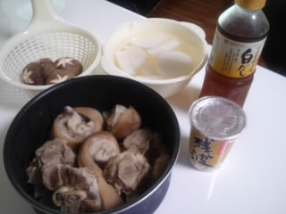 ||ヽ(*・∀・*)ノミ|Ю こんにちわぁー 今日は、曇り空・・お空と、にらめっこしながらの、お洗濯です(。¬д¬。)ジィィ──ッそうそう、沖縄って旧盆で、明日がお盆らしいです・・スーパーでは、お盆セールとか、やってて(*・`o´・*)ホ―昨日、豚足のぶつ切りを、見つけたので、『てびち』に挑戦してみようかと・・うまくできるのかしら(´・ω・`)モキュ?ネットで、レシピを、みて・・まず、豚足のぶつ切りを、1時間あまり、灰汁をとりながら、煮ました(・∀・)ウン!!これで、余計な脂分と臭みが、とるためみたいです・・昨夜は、ここまで!水気を切って、冷蔵庫に保管しておきました・・だって、お家に、泡盛が、なかったんですもの(笑´∀`)ヶラヶラこれが、材料です'`ィ(*´ェ`*∩鍋に、豚足、大根、泡盛(180cc)、水(820cc)、白だし(100cc)入れて・・これを、弱火でコトコト、5~6時間も、煮ていきます工エエェェ(´゚д゚`)ェェエエ工椎茸は、仕上げのころに、入れる予定♪そして、最後に、塩で、味を調整して、出来上がりなんだけど・・うまく、できるのかしら(。´д`) ン?コラーゲンたっぷり、お箸でも掴めないくらい、トロトロになりますように~♪お夕飯のころには、完成予定です(o´艸`o)報告は、後程・・ヽ(☆・ω・)**+:。.。:+*Вчё~あんしぇや~Вчё*+:。.。:+**(・ω・★)ノランキング挑戦してます・・もし、よかったら↓↓↓の、『わんこの写真』を、クリック願いします(^~^)ノ凸ポチ