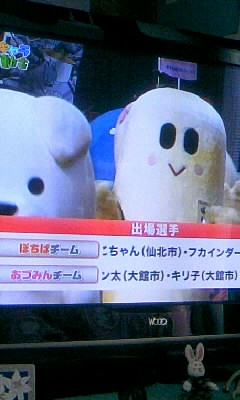 これはどう見ても秋田でしか見られない番組。こっちにいるうちに放送されたのは超ラッキー\(^o^)/秋田県のご当地ゆるキャラが2チームにわかれてかけっこ・二人三脚・玉入れ・相撲・パフォーマンス対決・玉ころがし・リレーの7競技で対決。秋田だけにきりたんぽ・だまこ系のキャラ多数。各自治体から出てるのに、うちの地元からは何もなし…(=_=)。…そういえば、スギッチはいないんだろうか?「ゆるキャラ」の名付け親?だという みうらじゅん氏の解説つきで競技がスタート。「(かけっこは)足の可動域が大きいキャラが有利」「視界の広さも重要」「(玉ころがしは)人がたのキャラの働きが鍵を握る」など、いちいち解説が大袈裟に真面目で笑えましたσ(^◇^;)。。。。「玉入れ」は「玉を掴めないキャラや投げられないキャラがどう働くか」がポイントと言われる中、BCリーグ秋田ノーザンハピネッツのマスコット・ビッキーがダンクシュート(?)を連発、両チーム無駄に山のように玉が入ってて爆笑。「相撲」はいっちょまえに「先鋒・次鋒・中堅…」が決まってて、大将戦までもつれました(笑)。「玉ころがし」は、手の短いキャラが苦しんでましたσ(^◇^;)。。。でもみんな正々堂々とクリーンに戦ってて、放送席も「これはずっと見ていられますねσ(^◇^;)。。。」と言ってたくらいほのぼのと面白かったですね(*^_^*)。多分これをNPBでやったら、内海さんなど相手の玉を蹴り飛ばしそうだし、いつの間にか玉がスターマンに変わってそう(爆)。いちいち負けたほうがすごい落ち込んでうなだれてたり、床を叩いて悔しがったりする図がまた面白くて、2時間の放送があっという間に終わってしまいました。いつか、12球団マスコットが一同に会した運動会が見たいもんですが、あの「自由すぎる」人たちが集まると、仕切る人の気が狂うかも(笑)知れませんので無理かなσ(^◇^;)。。。
