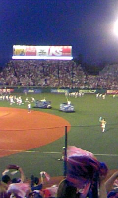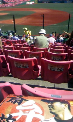 晴天のもと、やっとコボスタに来られました。今日は連れがファンキー加藤を見たいために珍しく内野席。…暑い!σ(^◇^;)。。。今年で食べ納めの、「斎藤すかし弁当」を食べました。永井君弁当がなくなった今、すかし弁当美味しくて好きだったのになあ…(=_=)試合は初回から楽天の守備がボロボロで、他人事だと思うと笑っていられますが(今年は笑えんて、うちも|||(-_-;)||||||)今のところこんな試合なので、実感したのは、普段いるライト自由の良さって、楽天ファンの汚い野次がほとんど聞こえないことだなと(ΘoΘ;)…いや~、聞くに耐えん野次だなヾ(^_^;