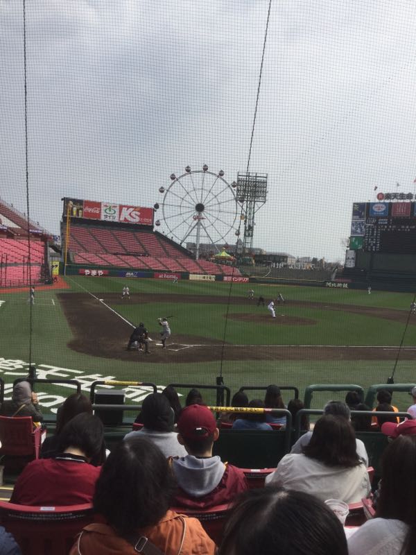 【日本ハム】6平沼 4難波 3清宮 D高濱 9岡 5今井 8姫野 2郡 7渡辺 P斎藤【楽天】9聖澤 4西巻 D枡田 5内田 8フェルナンド 3山田 2 足立 6松本 7田中 P戸村毎年、新年度のこの時期に仕事サボって2軍の試合を見に来るのが恒例に(爆)今年は利府球場が改装で使えないとかで、この「森林どり」球場(私的に旧デンスタ)でばかり組まれている。今後、巨人戦を見に来ることを考え、沖楽に見られるカードで客席の偵察も兼ねてハム戦を見に来た。去年までの、「地べたに体育座り」じゃなくて、ちゃんとスタンドがあって、ビジターの選手が見たいなら、こっちの方がいいかも。投手は特に、ダグアウト席の方には来ないし。しかし、私がこの球場に来ると必ず凄い快晴である・・・今の時期はいいが、6月以降は暑くて日よけもなく辛いぞ・・・ハム、何気に監督、コーチが豪華。監督が荒木大輔(だったのか^^:)、コーチに吉岡(ごめんoさん、さっきそこ通ったのに写真撮りそびれた^^:)、高橋信二、紺田の巨人OB・・・実松もいるわ。楽天が池山監督だから、「ヤクルト対決」だ。ハンカチが投げる模様。知ってる人が投げるほうがそりゃ楽しいわ来る前に、ずっと行ってみたかった「コメダ珈琲」に初めて行けた。定番の、モーニングセットを食べたんだけど、安くて美味しくて結構デカい大満足あ、清宮三振にほんブログ村