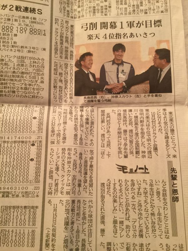 久しぶりで、会社の河北新報の一部を「強奪」昼休みが終わったところで、そっと真ん中辺のスポーツ欄を抜いてきました、このあと誰かにカップラの汁とかこぼされると困るからてか、いいんですよ、「それは社会的にどうかと思う」とか「窃盗では?」とかいう話ではないので、大丈夫。・・・とか書かないと事情を知らないめんどくさい輩が湧きそうで(書いても湧くかもな・・・めんどくさい世の中になった)そろそろ投手の「当たり」がほしいところ。頑張っていただきたいですね。さて、「めんどくさい」と言えば、うちにかなりめんどくさい人がいるので早く日本シリーズ終わってくんないかねもうこのチームを日本シリーズに出してないで、来年はわが軍が行かないと!!第5戦は、「惨事」が起こる前にめんどくさいので寝た(笑)のだが、この「惨事」に見舞われた投手、シーズン中内容はツッコミどころ満載ながらあれだけセーブを稼いで頑張ったのにポストシーズンになるとこんな感じになる。・・・そんな投手がわが軍にもいたけどね。「来年こそ、日本シリーズも自分が締めて日本一に!!」と誓いながら叶わなかった・・・彼は来年は何をやるのだろう??という、来年の仕事ネタについて、次のエントリーに続きます。にほんブログ村