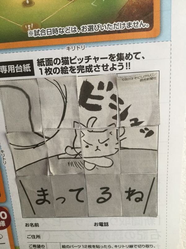 4月25日~5月6日までの12日間、読売新聞の隅っこに載っている「猫ピッチャー」の絵を切り抜いて貼り、1枚の絵を完成させて応募すると、抽選で豪華商品が当たるという懸賞があったので、頑張って完成させた完成するときには10連休が終わる、という寂しさもあったけど、この前も書いたけど、私的には5日に息子が帰ったときのほうが寂しかったのでまだセーフその息子も、また今度の土曜日に来るかもしれないのでそれを励みにちなみに、東京ドームのエキサイトシート等も当たるんだけど、いつの試合か選べない(「いつ頃」なのかさえわからない^^;)ので、当たっても行けない日だったらはずれと一緒なのでこれはパス。金額も「10000円」と大きいので、無難に200名に当たる図書カードにしました。さて、今日(8日)の試合についての記事「歴史は繰り返す(仮題)」はこのあと準備出来次第アップします。「まっててね」にほんブログ村