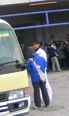 まあ、私は素人ですからわかりません。右の写真でも、B球場へ移動する前にバスの入口でインタビューに答えてましたが、なんて答えたんだろ?