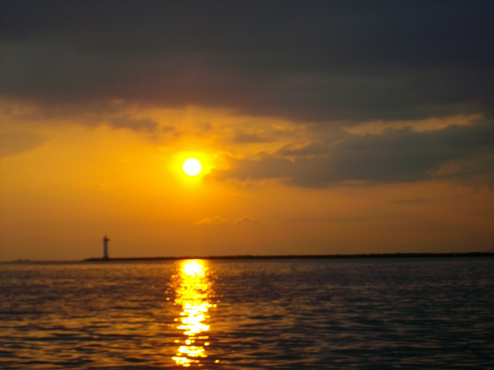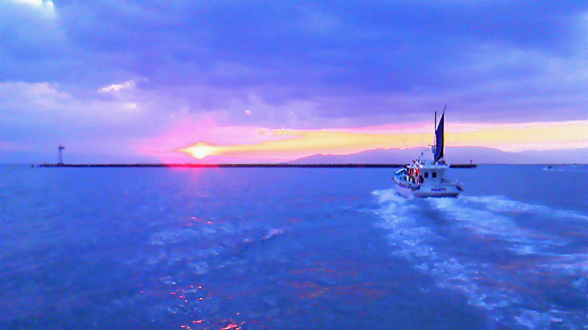 6時位の日の出マザキ沖から一枚左に見えるのはマザキの灯台ですな灯台も朝日を待ち焦がれていたような一枚になりました…灯台さん一日お勤めご苦労さまでした… 少し寝不足気味で朝一船に向かう…何を隠そうわくわく感に支配されて寝るに寝れない前日を過ごしました! 記念すべき 竿卸しの日となりました午前中の風速は2メータ位午後にかけて沖には白波が…そんな中初あたりはおいらの竿!当たり竿になりましたな~………と…思いたいところですが…船長の竿上げの声とともに巻き始めたリールにやたらと重い感が… 釣れてる??乗り適には釣った感よりも釣れちゃった感が強くて…ナンチャッテ釣り人になりましたっすね~トホホホホその後のオイラは海の神に見守られつつ一日を終わり納竿途中船長には立て続けに当たりが… そのうちの一枚はこれ お土産にって 船長からの頂き物で今晩のオカズになりました!天然のタイ…おいしそうですね久々にタイの刺身にありつけるなんてもうハマチャン幸せーその後少し早めの十時半帰港となりました!船酔いでゲロゲロ吐いている おいらの姿を見かねた船長のきまわしか?悪いことしてしまったようでヤンスこの次はがんばっちゃうからねきっと…