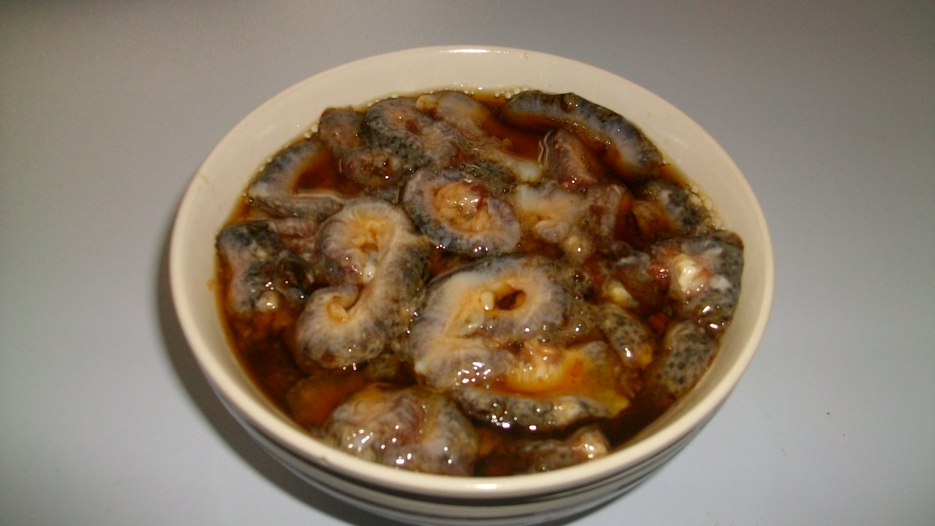 今日の晩飯は漁師さんからの頂き物で大盛りナマコでヤンス!!! ポン酢で〆ているデヤンスよ!肝の塩辛も上手い具合に出来上がっているようデヤンス あ~晩御飯が待ちどおしい!!