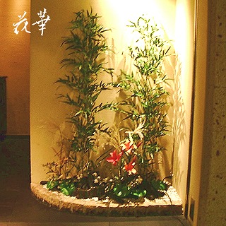 竹の影も風情があります。お店の入り口右側のディスプレイは大きな竹(高さが160cmほど)をメインに、季節のお花、そして、根元には、沢山の炭があります。入り口から店内へのアプローチ。左右には、炭のオブジェを配してあります。日中(ランチ)に行くと、フレッシュなグリーンのテーブルアレンジメントが楽しめます。同じものですけど(ゴールドのキャンドルが付いていないだけ)照明一つでこれだけ違います。照明を落とすとこんな感じに。こちらの写真は、西新宿・炭火キュイジーヌ くう 様のHPに掲載されているものと同じです。キャンドルに火を灯してありますね。西新宿・炭火キュイジーヌ くう 様の初回のディスプレイ・店内装花の模様をようやく掲載しました。でも、作業後の撮影の為、手が震えていて(結構力仕事だったりします)画像がブレていて残念。店内はとても広く、お料理もとっても美味しそうです。カップルで展望を楽しみながらお料理を頂くのも素敵だし、接待などにも利用される人も多いと伺っています。お近くの方は、是非行ってみてね。フ~シャンも行ってみたい!アトリエ花華ではオフィス・各種店舗のディスプレイ・店内装花も承っております。ご相談は無料ですので、お気軽にお問い合わせくださいませ。ウエディングブーケ&ブートニアの早期割引(早割り)、好評受付中アートフラワー(上質造花)&プリザーブドフラワーのことなら アトリエ花華で!