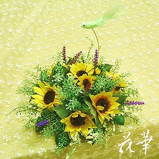 久しぶりにフラワーアレンジメントの講習会(花華会)の生徒さん・康子さんのレッスンがありました。今回は、夏を意識してヒマワリとラベンダー、それにグリーンの小鳥が飛んでいるテーブルアレンジメント。康子さんの息子さんが経営されている学習塾のラウンジに飾るお花を制作されました。子供やそのお母様たちにも楽しんでいただけるように、小鳥ちゃんを飛ばしてあります。当初、ヒマワリはあまり好きではない、と言っていた康子さんですが、今回のレッスンでヒマワリを好きになってくれたみたい^^。季節ごとに、塾のお花を替えてあげるそうです。生花だとお水の替えや費用の面でも大変だけど、アートフラワーなら手間要らずで、長く楽しめるので、良いアイディアですね。アトリエ花華のコサージュ・ヘッドコサージュ(髪飾り)販売中!成人式、卒業式、入学式など各種パーティーにもご利用いただけます。画像をクリックすると沢山のコサージュのページに飛びますよ!アトリエ花華のHPはこちらをクリックしてネ↑。アートフラワー(上質造花)&プリザーブドフラワーのことなら アトリエ花華で!