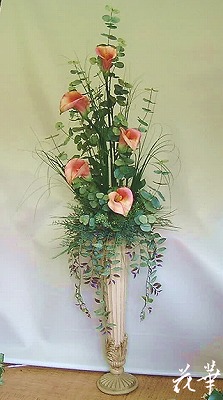 左側からの撮影。サイズはW&H 126cm x D 84cm右側からの撮影。ん~、ディスプレイ後の撮影なので手が震えていて(実はかなり肉体労働なんですょ)、ブレていますね。残念。花器は、ヨーロッパ製のもの。花材は、どれもリアルなアートフラワー(上質造花)を使ってあります。あちゃ~、コレもブレています。デジカメが古いというのも原因の一つ。先日、渋谷・常磐松のマンション装花・ディスプレイに行ってまいりました。フラワーアレンジメント講習会(花華会)の生徒さん・T陽子さんも見てみたい!ということで、ご一緒でした。立っている者は、親でも使う、と言いますが、T陽子さんにお手伝いいただきまして、とても助かりました。渋谷駅からバスで2駅の青山学院初等部前で降りると、スグ隣の敷地は、常陸宮邸。六本木通りから少し入るだけで、全然風景の変わる場所でした。ここ阿佐ヶ谷の庶民的な空気とは違う感じ。常陸宮邸をグルリと周り、たどり着いたマンションで、早速活け込み開始。なにやらT陽子さんが、携帯で活け込みの過程をパシャリ、パシャリ。フ~シャンの後姿、大きなお尻が写るかと思うと、気になります。T陽子さんに、梱包で折れ曲がった花材などを真っ直ぐにしてもらい、花器のフローラルホームの部分に、ドライの山苔をはり、高さのあるシンビからアレンジメントの開始です。途中何度も後ろに下がり、全体のバランスなどを見ながら約2時間半で出来上がりました。マンションの管理会社(三菱地所藤和コミュニティ株式会社)のご担当のK氏、近くによってジッ~とご覧になっていました。そっと手で触っていました。そして、「いわゆる造花のテカテカのイメージとは、全然違いますね」と、ニコニコされていました。良かった。人の好みは様々だけど、フ~シャンとしては心残りなくお仕事させていただきました。クリスマスリース販売中!アートフラワー(上質造花)&プリザーブドフラワーのことなら アトリエ花華で!