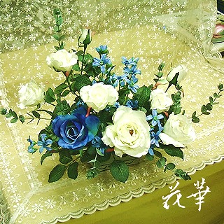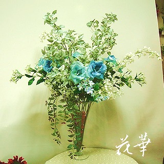 アトリエ内を飾っていた大きな円錐形のガラスの花器にターコイズブルー(2色)の大輪のバラ、デルフィにウム(ホワイト)、オレガノ、カスミソウ、それに沢山のヒメ林檎などを投げ入れたインテリアフラワーが先日御売約済みになりました。サイズは約H94cm x W85cmです。追加の花材として、垂れ下がるサルビアバイン、ステファノーチス(ホワイト&ブルー)をいれさらに豪華に。この週末に受け取りに来ますので、先日追加の花材とのバランスを考えならが、リアレンジしたところです。中野からご家族でおみえになり、新築のお玄関に飾るインテリアフラワーをお探しでした。あちこち都内の百貨店を探し回ったけれど品数が少なくて、気に入ったものが見つからなかったそうです。そこで、インターネットで調べてご来店してくださったというわけです。秋冬は、お花を入れ替えてまた違った雰囲気を楽しんでいただけますね。またのご来店をお待ちしておりま~す。アトリエ花華のコサージュ・ヘッドコサージュ(髪飾り)販売中!成人式、卒業式、入学式など各種パーティーにもご利用いただけます。画像をクリックすると沢山のコサージュのページに飛びますよ!アトリエ花華のHPはこちらをクリックしてネ↑。アートフラワー(上質造花)&プリザーブドフラワーのことなら アトリエ花華で!