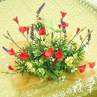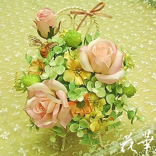 ホームページ掲載のインテリアフラワー(アートフラワー)のアレンジメントには限りがあるので、できるだけアトリエ内の新作商品などもブログでご紹介していこうと思います…といっても、毎日は無理かも。今日は、小鳥の舞う竹篭のフラワーアレンジメントを2個ご紹介します。野に咲くお花のイメージでアレンジしてみましたぁ。↑は緑の小鳥、下は黄色の小鳥が舞っています。使っているお花は、ポピー、ラベンダー、ユーカリ、カモミール、ベルフラワー、ミニグロリオサ、カーネーションなど。同じ竹篭で同じデザインでも、花材が違うと印象がかわりますね。アトリエ花華のコサージュ・ヘッドコサージュ(髪飾り)販売中!成人式、卒業式、入学式など各種パーティーにもご利用いただけます。画像をクリックすると沢山のコサージュのページに飛びますよ!アトリエ花華のHPはこちらをクリックしてネ↑。アートフラワー(上質造花)&プリザーブドフラワーのことなら アトリエ花華で!