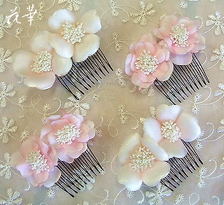 ウエディングドレスや色打ち掛けを着る時に、気になる髪飾り(ヘッドドレス・ヘッドコサージュ)を手作りで制作しています。白い生地から手染めでオリジナルの色に染め上げています。コーム付なので、簡単に装着できます。バラバラに着けたり、並べてお花のボンネのようにつけたり出来るように4ピースセットになっています。頭の丸みやヘアースタイルにあわせて、前から後側へグルリと繋げても素敵!花びらはサテンやシルクオーガンジー、ポプリンなどの生地に手染めで染色した布花です。同じデザインでピンクやオリーブ色などもご用意してあります。ご要望に応じて、ドレスやお着物と同じお色で制作も承ります。↑の画像をクリックするとアトリエ花華のホームページにジャンプします。アトリエ花華