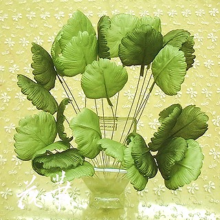 台風4号の影響で東京もずっと雨降り。四国では、取水制限が解除され良いこともあるけど…フラワーアレンジメントの生徒さんは、初めて彼をご両親に紹介するため、東京から神戸へ。無事に飛べたかしら...。おリボンで作るスミレの花の続きで、今日は不足していたスミレの葉っぱをおリボンで作りました。全部で30枚ちかく。葉っぱの表と裏では、おリボンの色が違います。表の色も2色使い。ワイヤーをいれ、葉っぱの形にカット、そして、三筋ゴテをあてると、葉っぱの脈や丸みがでてきます。可愛らしいスミレの葉っぱの出来上がり~。いよいよおリボンで作ったスミレや葉っぱを使って、アレンジメントの段階。どんなデザインにしようかなぁ。ウエディングブーケ?バスケットアレンジメント?コサージュ?いろいろ考えられますね~。アトリエ花華のコサージュ・ヘッドコサージュ(髪飾り)販売中!成人式、卒業式、入学式など各種パーティーにもご利用いただけます。画像をクリックすると沢山のコサージュのページに飛びますよ!アトリエ花華のHPはこちらをクリックしてネ↑。アートフラワー(上質造花)&プリザーブドフラワーのことなら アトリエ花華で!