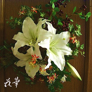 数日続けてお休みしたいなぁ~。取れないとなると余計に行きたいところが頭に浮かんできたり…沖縄、エジプト、ドバイ、ギリシャ、南米、南アフリカ…。ドバイは、宝くじが当たったらアトリエ花華・ドバイ支店を出店したいなぁ←あくまでも夢のまた夢…。ん?ドバイでは表だってお酒が飲めないって!それは困りますぅ。敬老の日に贈るインテリア・アートフラワーのアレンジメントとして、カサブランカの壁掛けをホームページにアップしました。手間要らず、水いらずのインテリア・アートフラワーは、実店舗でもご高齢の方に人気があります。上質なアートフラワーでオリジナルのデザインのギフトは、いろいろな物に飽きてしまった、目の肥えた年齢層の方にも喜んでいただけます。寝たきりの方でも、壁掛けやリースなら楽しんでいただけますね~。花径約20cmの大輪のカサブランカはとっても気品&華やかさがあります。使用してある花材は、カサブランカ、ハニーベリー、ミニグロリオサ、アイビー、ラベンダーなど。実は、この壁掛け、花器を使っていないので、そのままポンとテーブルに飾ることが出来るんですょ♪。地震で落ちて割れたり、怪我をすることもなく、安心ですね。上の画像をクリックすると、敬老の日に贈るリースや壁掛けのページに飛びます。アトリエ花華のコサージュ・ヘッドコサージュ(髪飾り)販売中!成人式、卒業式、入学式など各種パーティーにもご利用いただけます。画像をクリックすると沢山のコサージュのページに飛びますよ!アトリエ花華のHPはこちらをクリックしてネ↑。アートフラワー(上質造花)&プリザーブドフラワーのことなら アトリエ花華で!emoji code="h415" />