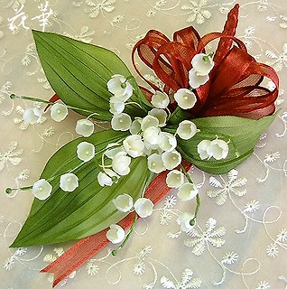 鈴蘭のお花が40個ほどついた、鈴蘭のコサージュ。白い生地(サテン)を手染めで仕上げたもの。40個の鈴蘭、とても根気のいる作業。鈴蘭の葉は、グリーンのグラデーションが出るように染色。とても可憐な鈴蘭のコサージュが出来上がりました。ジョーゼットのおリボンはご要望に応じて、ブルー、グリーン、ホワイト、ピンク、クリーム色に変更することも出来ます。↑の画像をクリックするとアトリエ花華のホームページにジャンプします♪アトリエ花華