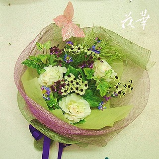 既に期日前投票を杉並区役所で済ませたフ~シャン、今回ほど、気になる選挙は初めて。さぁ~、この偽景気の中、国民の意思表示は、どのような結果を生むでしょう。インドでは、女性初の大統領が誕生。日本では…公人の失言撤回、疑惑の資金…いつまでこんなことを繰り返しているのでしょうねぇ。日本はある意味遅れている国かも。新作の”蝶の舞う花束風壁掛け(インテリア・アートフラワー)”は壁に掛けても良いし、取り外して、そのままテーブルにも飾れる2wayタイプ。サイズは約45x50cm蝶はフェザーで出来ているから、チョイ高級感あり!使用している花材は、バラ、ピンオーク(露付き)、アゲラータム、デイジー2種類、スプリンゲリーなど。華やかな大輪のバラに野草やグリーンでまとめてある爽やかで品のある色合いです。ラッピングは、パープルとモスグリーンのシナマイロールでフンワリと。敬老の日のプレゼントにもお勧め♪↑の画像をクリックすると敬老の日の贈り物のページに飛びます。アトリエ花華のコサージュ・ヘッドコサージュ(髪飾り)販売中!成人式、卒業式、入学式など各種パーティーにもご利用いただけます。画像をクリックすると沢山のコサージュのページに飛びますよ!アトリエ花華のHPはこちらをクリックしてネ↑。アートフラワー(上質造花)&プリザーブドフラワーのことなら アトリエ花華で!