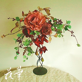 フ~シャンの制作する商品で、当店のHPでご紹介できないものが沢山あります。期間限定でしか入手できない花材の場合は、どうしても、定番商品としてHPに載せ難いからです。そして、そういう商品は、店頭に出してもすぐにお嫁入りの為、なかなか皆さんにご紹介できないのを常日頃残念に思っていました。そこで、できるだけブログでご紹介していこうと思います。サイズ: H46cm W50cm D25cmこちらは、アイアンのスタンドに深い色合いの花材で制作した、空間を楽しめるインテリアフラワー(フラワーアレンジメント)です。全体にエレガントで動きのあるデザインですね。アトリエ花華のコサージュ・ヘッドコサージュ(髪飾り)販売中!成人式、卒業式、入学式など各種パーティーにもご利用いただけます。アートフラワー(上質造花)&プリザーブドフラワーのことなら アトリエ花華で!